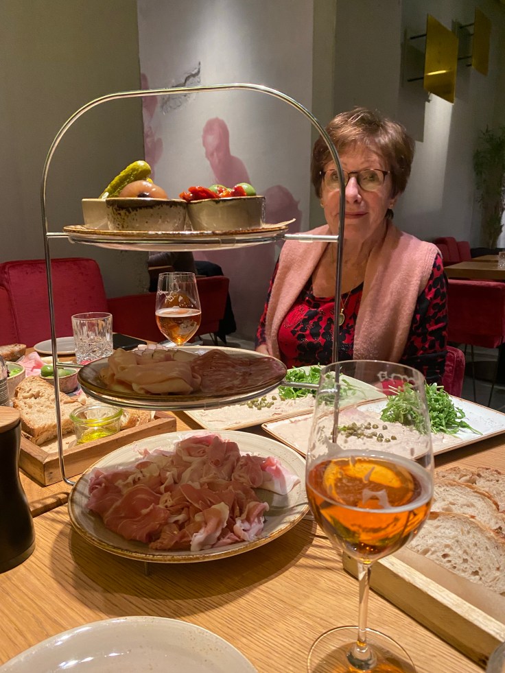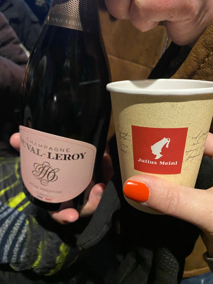 Nach unserem Deidei jedenfalls ging es wieder zum Stephansplatz inklusive der Schleife durch den Stephansdom, wo nicht weit entfernt Tisch Nummer drei für uns reserviert war. Dieses Mal bei Wein und Co.. Und wie unschwer zu erraten, ist hier das Highlight eher das angeschlossene Weinlädle und nicht die Kulinarik. Aber das heißt nicht, dass man hier nicht gut essen kann. Denn gleich am Eingang empfing uns die typische Austernbar, die wir gekonnt umschifften und im Untergeschoss versteckte sich die riesige Weinauswahl, die man sich für einen kleinen Aufpreis dann auch hoch an den Essenstisch liefern lassen kann. Natürlich auf die richtige Temperatur gebracht und sorgsam entkorkt. Allerdings kann es da so passieren, dass man nun statt in die Weinkarte in den Weinladen eintaucht und somit mit mehr als einer Flasche wieder auftaucht. So auch wir, die gleich noch einen Champagner für 0:00 Uhr einsackten. Denn auch wenn es tatsächlich an den Glühweinständen von Wien echten Champagner zum Trinken gibt, so vertrauen wir doch unserer eigenen Auswahl mehr, als der Auswahl der Glühweinverkäufer.