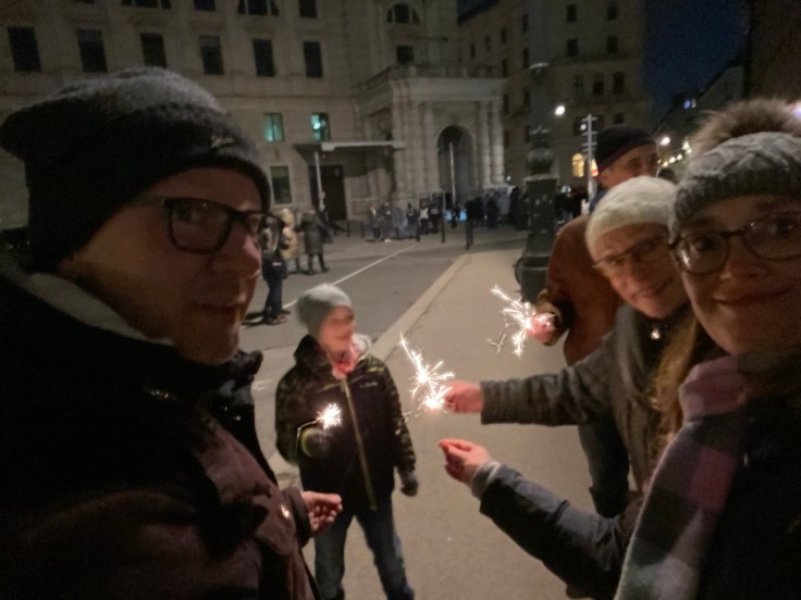 Aber all das spielt jetzt keine Rolle, denn die Überraschungszeit ist gekommen. Neben meinen Eltern sind nämlich nun noch weitere Familienmitglieder in Wien. Meine Tante und mein Onkel stoppen hier über Silvester während einer Donau-Kreuzfahrt. Und sie haben keine Ahnung, dass auch wir hier sind. Also treffen sie sich nichtsahnend vor dem Stephansdom mit meinen Eltern und wir schleichen uns von den Massen gedeckt langsam heran. Als ich dann im Abstand von nur noch 15 cm vor meiner Tante stehe, geht sie nur zu Seite, weil sie denkt: Wieder so ein blöder aufdringlicher Tourist, der meinen Mindesttanzabstand nicht einhalten will.