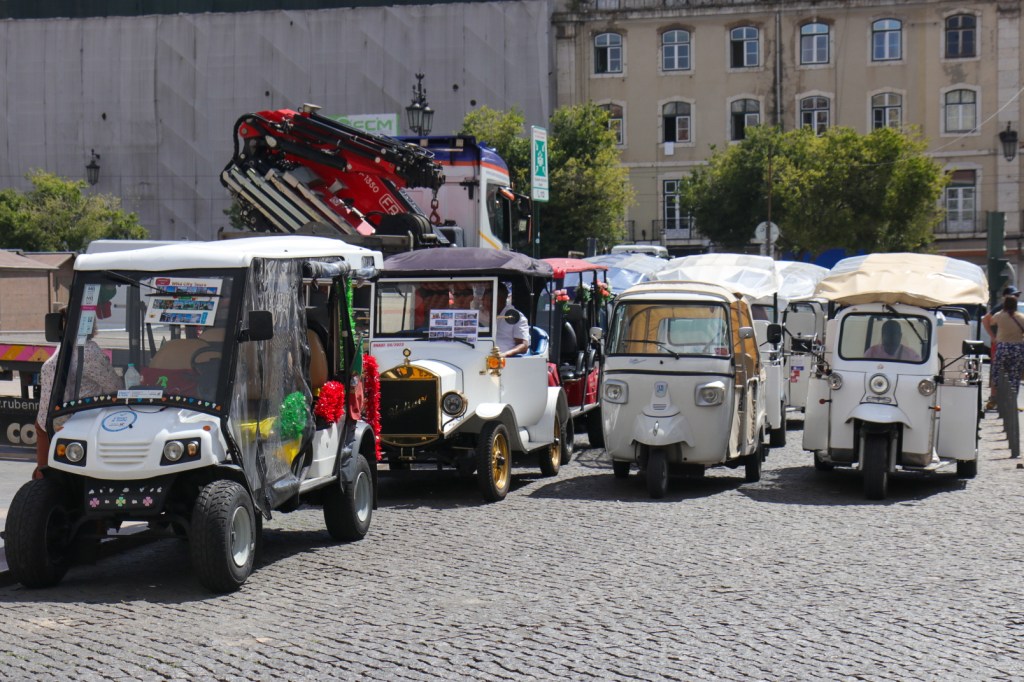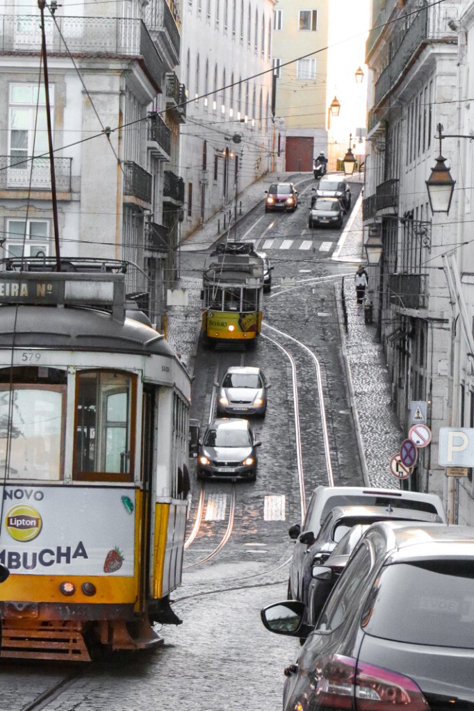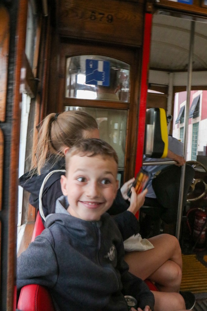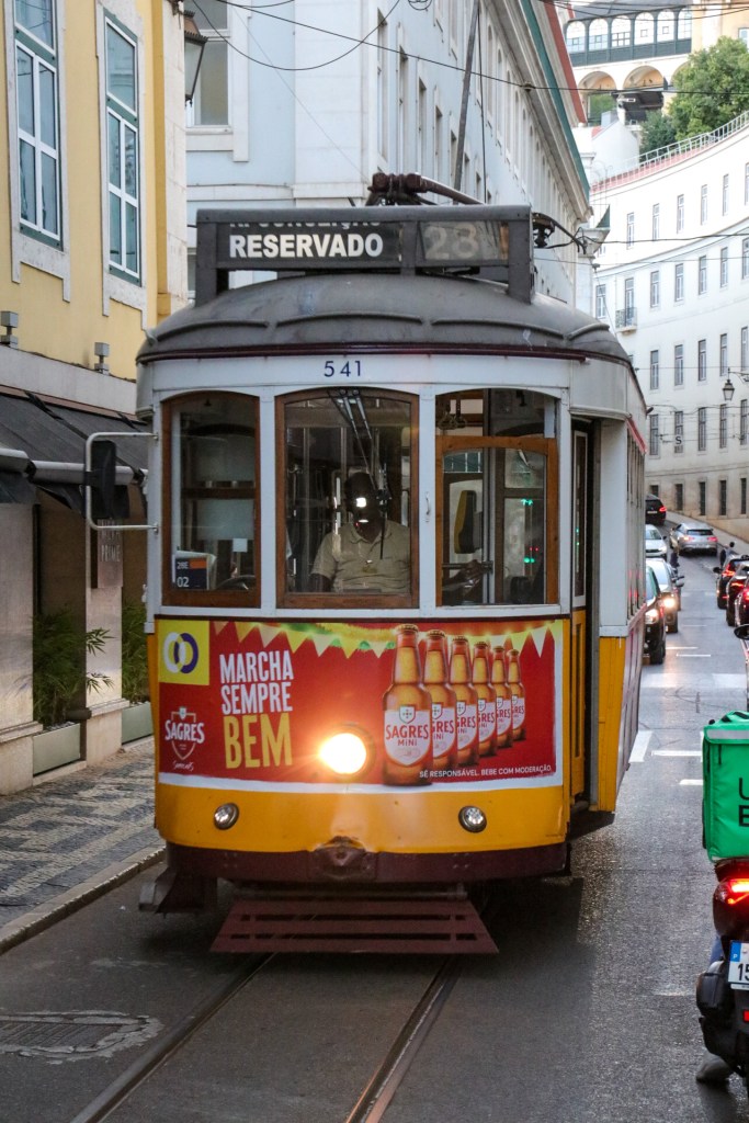 Nun hieß es langsam verabschieden von dieser schönen Stadt. Ein letzter Bummel, ein letzte Pasteis de Nata und ein letzter Powernap bevor die Abendtour beginnt. Ein paar Punkte standen allerdings noch auf unserer ToDo-Liste. So zum Beispiel einer dieser Kioske mit Ausblick aufs Meer und einem schönen Gläschen Rotwein zu typischen Snacks der Region. Und was natürlich auch nicht fehlen durfte, war die Fahrt mit der historischen und typischen Straßenbahn hier in Lissabon. Bisher hatte uns so einiges von einer Mitfahrt abgehalten. Zuerst einmal die vielen, vielen Touristen, die den gleichen Gedanken hatten. Am Haupteinstiegspunkt in der zentralen Stadt stehen tagsüber Schlangen von locker 500 m Länge. Und in jede Bahn passen gepresst vielleicht 20 Leute? Da muss man viel Geduld haben und wir zählen wirklich nicht zu den geduldigsten Menschen dieser Welt. Selbst, wenn man irgendwo anders einsteigen will, braucht man Glück und muss immer damit rechnen, dass man als dritthäufigstes Souvenir von Lissabon endet, nämlich als Sardine in der Büchse und in diesem Fall mit der Nase in der Achselhöhle eines schwitzenden Touristen aus Irgendwo. Alles Dinge, auf die ich so gar keinen Bock habe. Also hielten wir bisher immer Ausschau nach den Bahnen, fanden aber nie die Richtige für uns. Bis zum heutigen Abend. Nachdem wir unsere Abendstimmung mit einem Glas Rotwein genossen hatten, wollten wir den Rückweg antreten. Und genau da hielt gegenüber eine der Bahnen und war tatsächlich nahezu leer. Also schnell einen Sprint eingelegt und rein in die Bahn für eine letzte Spritztour.