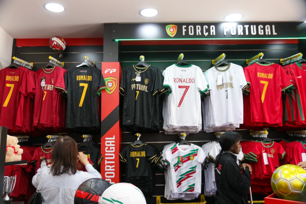 Heute sind wir dann diesem Phänomen CR7 etwas weiter auf den Grund gegangen und haben einen dieser unzähligen Shops der städtischen Fussballvereine, FC Porto, Sporting Lissabon und Benfica Lissabon betreten. Dabei muss man gar nicht lange suchen, denn in jeder der vielen Einkaufsstraßen hier in Lissabon gibt es diese Läden. Meist zwei-etagig und sehr groß. Und in jedem dieser Shops steht im Eingangsbereich eine lebensgroße Figur von Ronaldo hinter Glas. Und in jedem dieser Shops steht vor dieser Fake-Figur eine Schlange von Menschen, die sich mit Fake-Ronaldo fotografieren wollen. Wenn man seinen Blick von der wahrlich nicht schönen Nachbildung ablenkt, stellt man im Erdgeschoss fest, dass jedes T-Shirt, jede Hose, jede Jacke, jede Unterhose, jedes Cape die Nummer 7 versehen mit dem Namen von Ronaldo trägt. Und wenn ich JEDE schreibe, dann meine ich das auch so. Dabei spielt es irgendwie keine Rolle, dass eben dieser Fussballer ja aktuell nur in der Nationalmannschaft spielt, gerade auf der EURO 2024, und ansonsten irgendwo weit ab seiner Heimat für unverschämt viel Geld für die Vorbereitung seines Altersruhesitzes gelegentlich gegen arabische Kleinstvereine kickt. Mit Portugal und dem Lissaboner Fussball hat er recht wenig am Hut. Läppische 6 Jahre hat er hier Fussball gespielt, nur maximal 2 davon bei Sporting Lissabon, wo er gerade mal 3 Tore geschossen hat. Seine gesamte Karriere hat er ansonsten außerhalb von Portugal verbracht, wenn nicht gerade ein Länderspiel stattfand.
