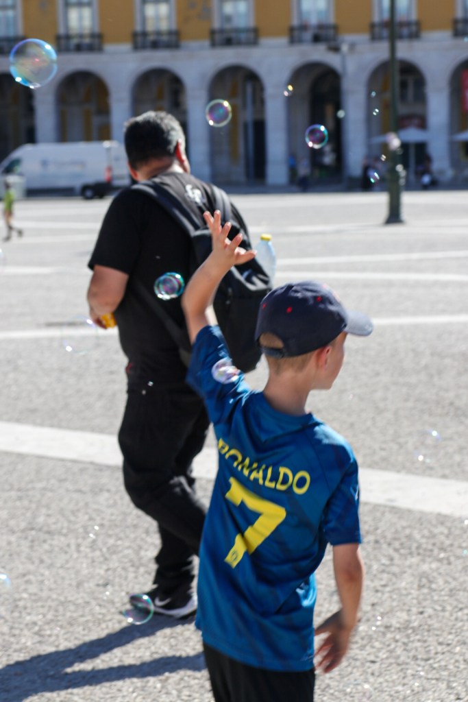 Alles fing schon auf der Fahrt vor zwei Tagen vom Flughafen zur Unterkunft an. Auf dem Flughafengelände lächelte uns gefühlt von jeder Ecke dieser eine Ballkünstler an. Und im Taxi wurde unserem Sohn als Erstes diese Frage ohne wirklichen Inhalt gestellt: Ronaldo oder Messi? Was soll da so ein Neunjähriger denn antworten? Etwa die Wahrheit sagen? Grundsätzlich erziehen wir unsere Kids ja zu wahrheitsliebenden Menschen. Aber wir erziehen sie halt auch zu Überlebenskünstlern. Und in Lissabon den Namen von Messi vor dem von Ronaldo zu nennen wäre einfach lebensmüde. Also antwortete unser Sohn lügengemäß: „Ronaldo“ und kassierte dafür ein breites Grinsen vom Taxifahrer, als hätte Georg eine echte Wahl gehabt. Das Thema Notlügen hat Georg somit ganz ohne Anleitung von selbst verstanden.