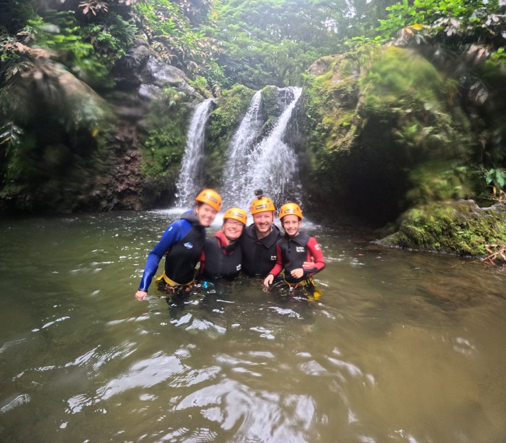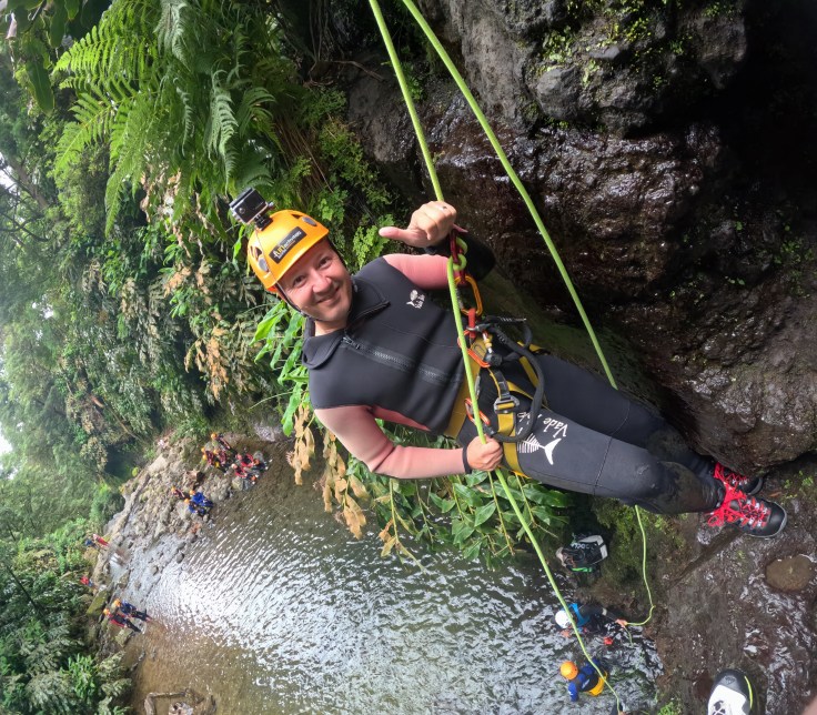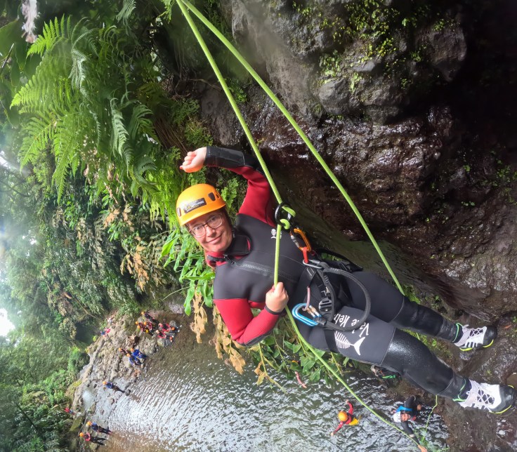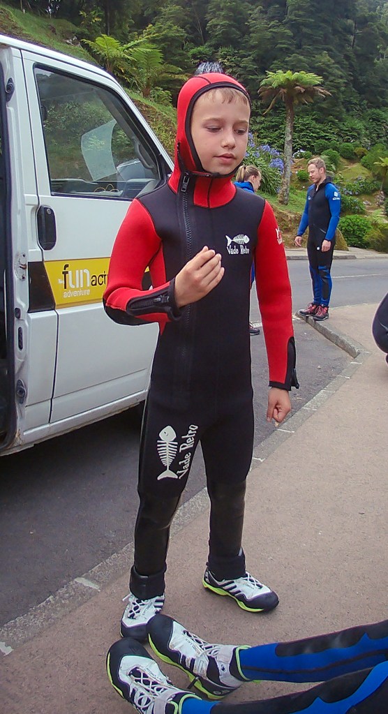 Der Park Natural ist übrigens wunder-, wunderschön. Überall fallen die Wasserfälle und die Pflanzen blühen in allen Farben und vor allem in allen Größen. Fantastisch. Das lenkte mich aber auch ordentlich ab, auf dem Weg entgegen dem Wasserlauf. Einen Teil hatte ich nämlich ignoriert, wer von oben runter will, muss vorher hoch. Und so stiegen wir in unseren viel zu engen Neoprenanzügen den Berg hinauf und japsten was das Zeug hielt. Ich glaube, zwischen Haut und Neopren bildete sich mittlerweile ein eigenes Biotop und ich verband damit die Hoffnung, dass ich am Ende des Vormittags ca. 5 Kilo leichter aus dem Anzug flutsche.