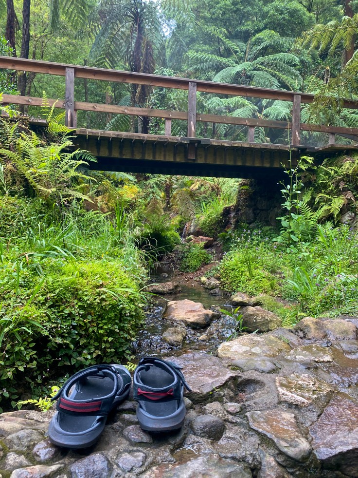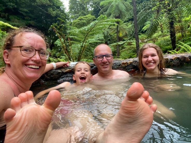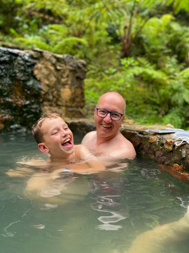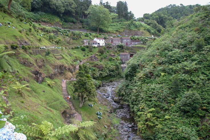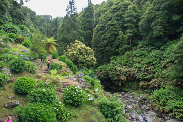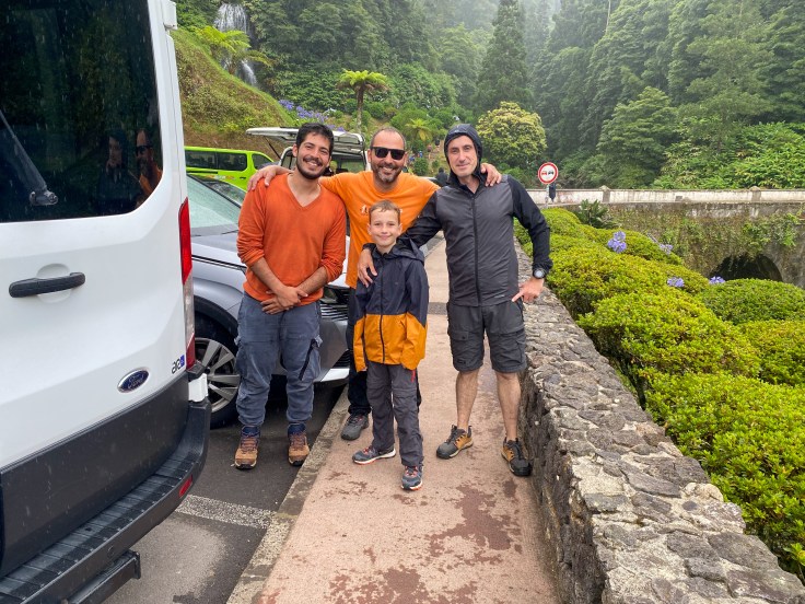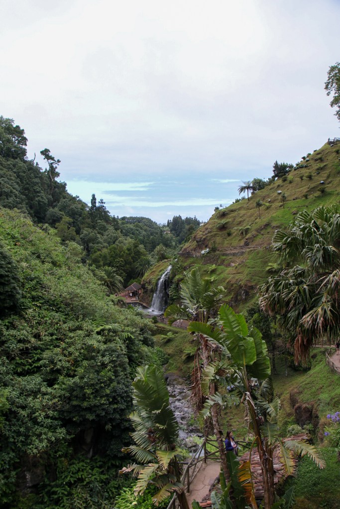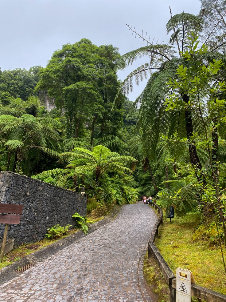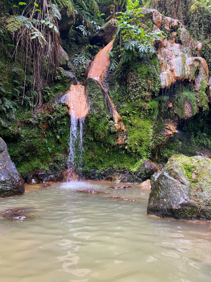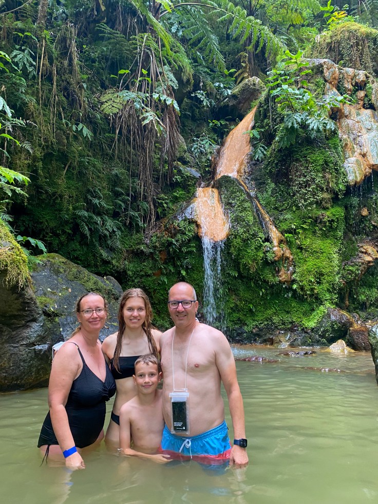 Und dann kam das nächste Highlight unseres wunderschönen Tages und es hatte schon wieder mit Wasser zu tun. Wir hatten uns einen Slot in den Thermalquellen der Caldeira Velha gebucht und zogen nun mit Badesachen und Handtüchern los. Was uns hier erwarten würde war uns nur in Ansätzen bewusst. Als wir ankamen entdeckten wir zuerst diesen unglaublich schönen Dschungel, voller Riesenfarne, Palmen und Hortensien. Und da waren sie, die ersten Becken mitten im Dschungel mit dem trüben Nass. Der erste Fuss wurde reingesteckt in diese heißen Quellen und sofort lächelten wir vier uns an. Hier würde unser Tag einen würdigen Wasserabschluss finden. So herrlich chillig. Über 30 Grad waren es in den ersten Becken und wir fühlten uns so wohl. Dazu regnete es ganz leicht von oben und das machte eine ganz besondere Stimmung. Weiter oben am Berg befindet sich dann noch ein Becken mit Wasserfall und selbst dieses hatte 28 Grad und war somit durchaus bebadbar, mal von dem Fotomotiv abgesehen. Eines der Becken schaffte sogar die 100 Grad und blubberte vor sich hin. Ich brauch nicht erwähnen, dass dieses natürlich für den Badeverkehr gesperrt war, aber es machte uns klar, dass wir dringend etwas wie gekochte Nudeln essen sollten.