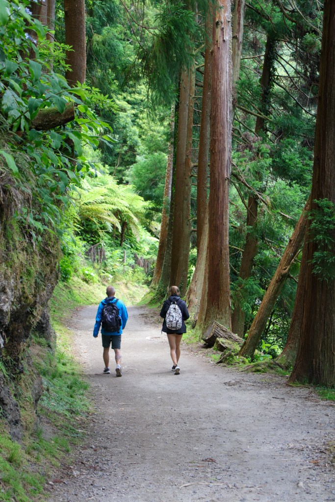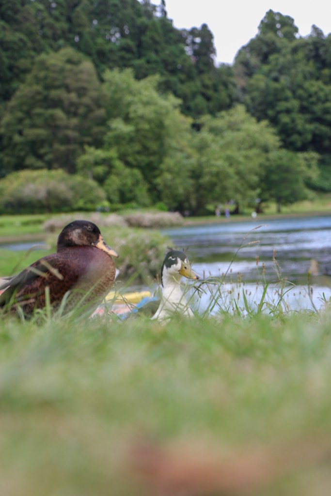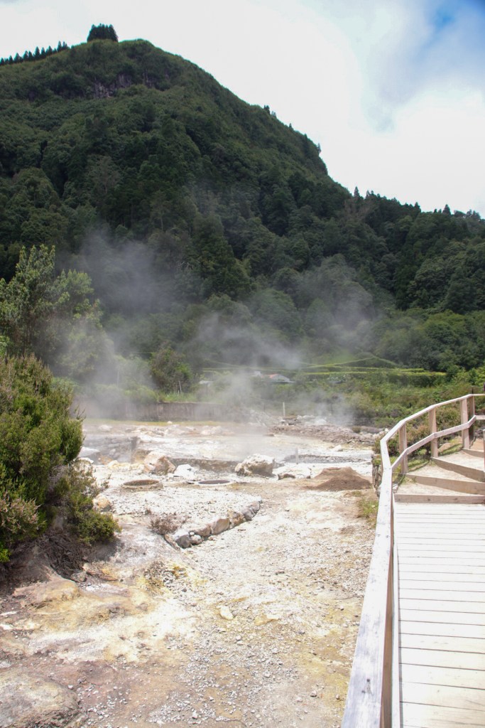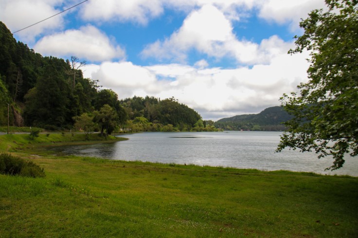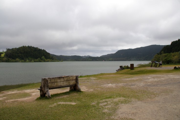 Aber irgendwann, nach furchtbar steilen Bergstraßen im 1. Gang, schafften wir es an den Lagoa de Furnas und nahmen uns die Seeumrundung vor. Bei Nieselwetter marschierten wir los und hofften auf eine leichte Wetterbesserung, die hier schließlich alle 5 Minuten einsetzen kann. Nach den ersten fünfhundert Metern stand am Wegesrand ein Verkaufsstand für Pina Colada. Genau wie in Lissabon direkt aus der Frucht. Allerdings war es selbst für unsere Verhältnisse noch etwas früh für einen Cocktail und ich bezweifele, dass ich es um den See schaffen würde, mit Schirmchen zwischen den Zähnen klemmend.