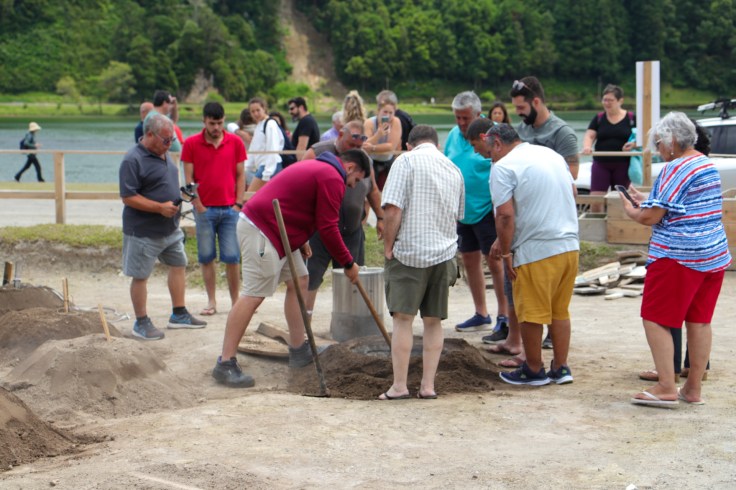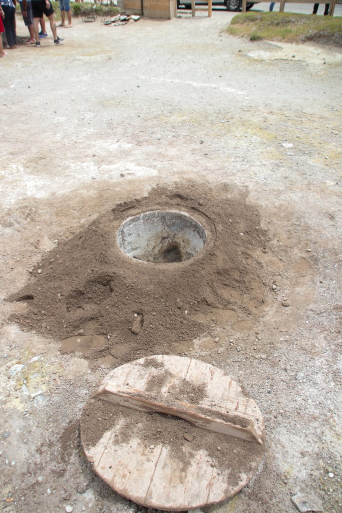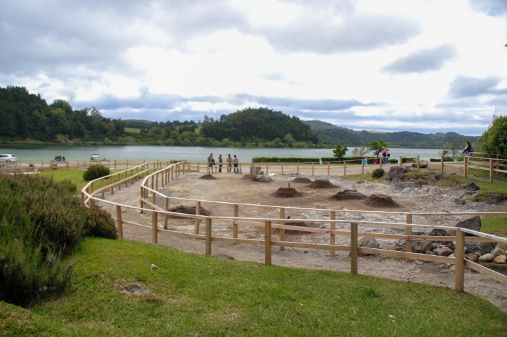 Gestärkt von einer ordentlichen Dosis Koffein ging es weiter um den See. Und plötzlich befanden wir uns in Mordor bei den Fumarolas. Hier ist die thermische Erdaktivität so hoch, dass die Insulaner und die Köche der Region diese als Herdplatte nutzen. Neben großen schwefelig dampfenden Erdlöchern werden kleinere Löcher genutzt, um dort slow-cooking zu praktizieren. Für ca. 12-24 Stunden werden in diese Löcher Töpfe mit Gulaschzutaten abgesenkt und nach dieser Zeit gar und zart aus der Tiefe geholt. Wir hatten das Glück, dass gleich mehrere ihr Essen abholten und wir so dem Treiben zuschauen konnten. Das machte uns natürlich neugierig und so buchten wir uns gleich daneben, allerdings in einer geruchsneutralen Umgebung, für einen Vulkansnack ein. Es gab hartgekochte Eier und einen Gulasch für uns und ich kann nur sagen, es war so lecker und reichlich. Von einem Teller Gulasch und drei Eiern wurden wir zu viert satt und hatten nun dicke Bäuche für die nächste Aktivität.
