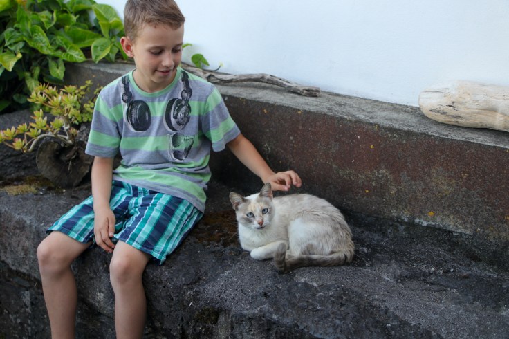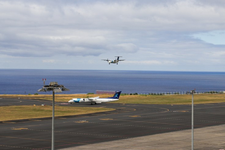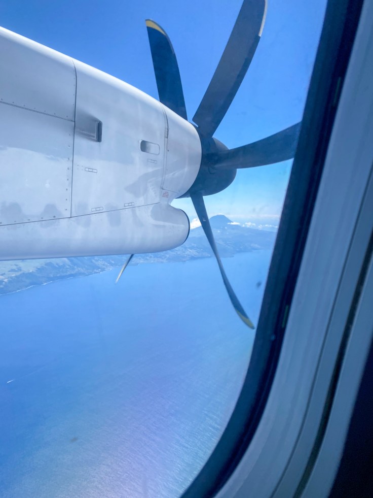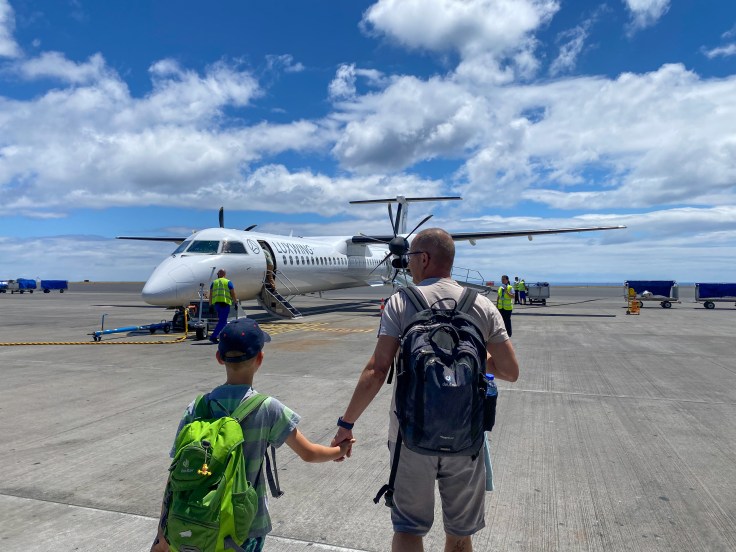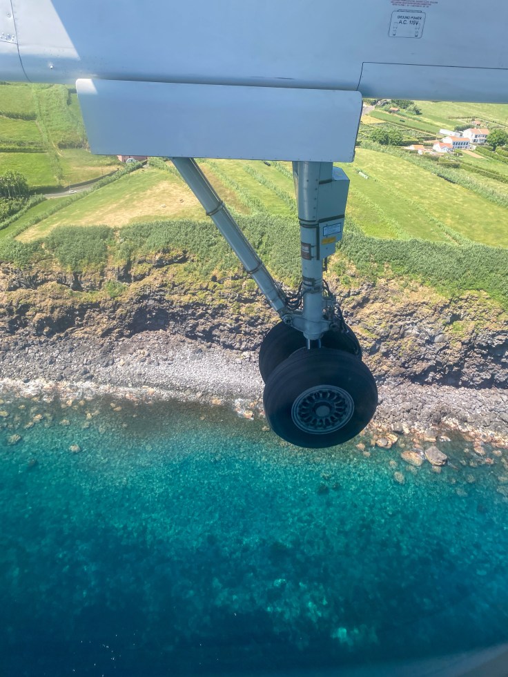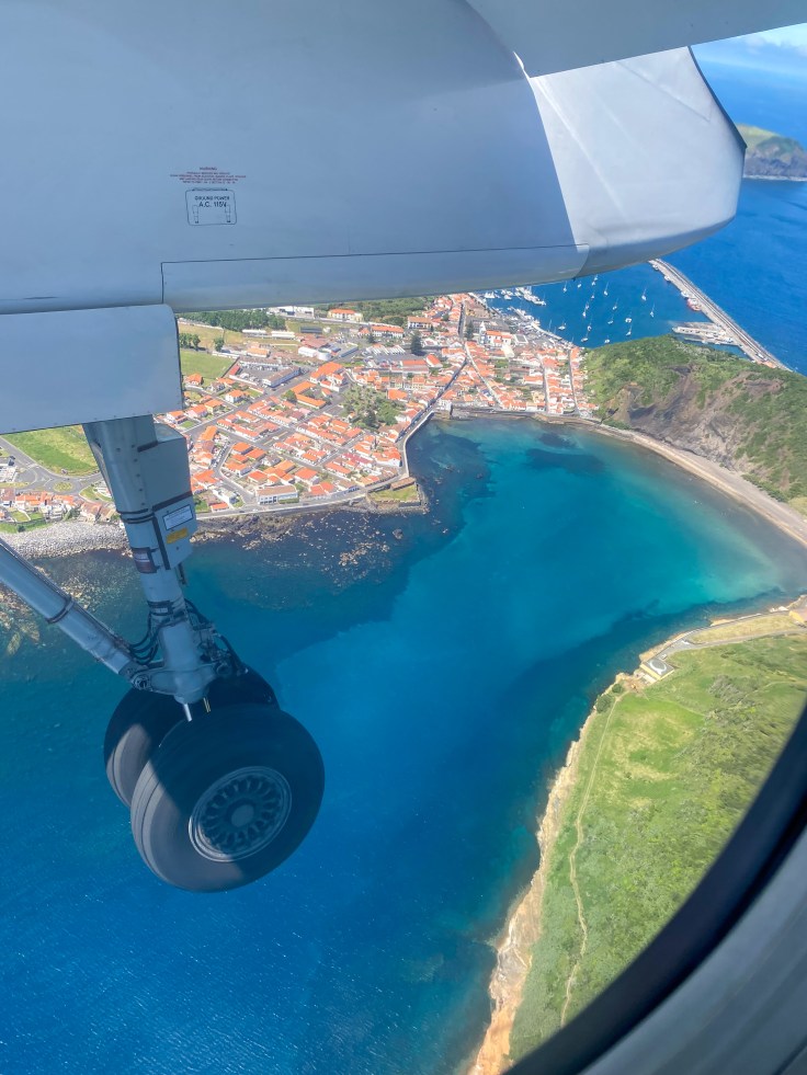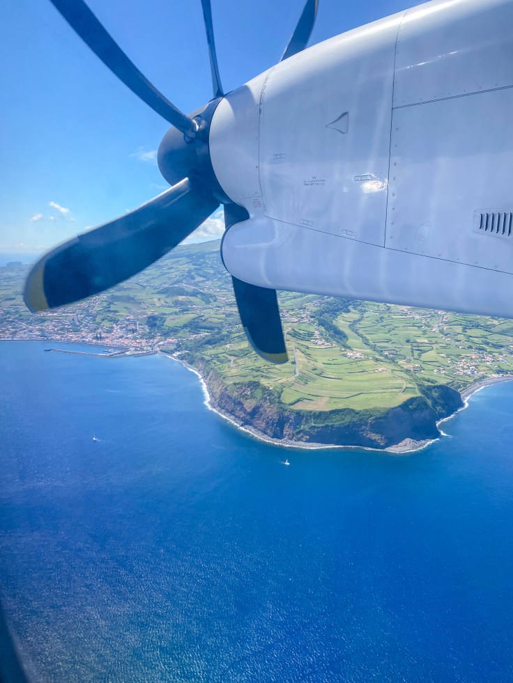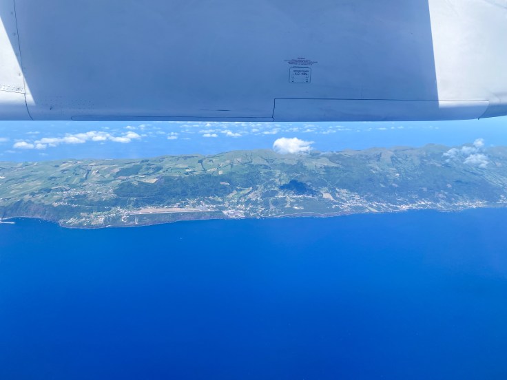 Gestern stand dann also der Wechsel von Sao Miguel nach Fajal an. Und dass ist hier bei den Inselprofi’s deutlich unspektakulärer, als man es sich vorstellen mag. Man steigt in den Flieger wie in den Bus und wechselt mal schnell in unter einer Stunde die Insel. Okay, die Sicherheitsvorkehrungen eines internationalen Flughafens gibt es natürlich, aber alles läuft ziemlich entspannt ab. Man könnte zwischen den Insel auch per Schiff pendeln, aber für uns als Familie ist es einfach super easy zu fliegen und die Zeit effektiv zu nutzen. Und so checkten wir irgendwann ein nach Horta, der Stadt auf der Insel Fajal. Uns erwartete eine kleine Propellermaschine und das war für uns nochmal eine ganz neue Erfahrung. Man startet gleich neben dem Meer, fliegt kurz mit Blick auf das Meer und entdeckt hi und da die ersten anderen Inseln der Azoren. Damit beginnt dann das lustige Inselraten, denn noch kennen wir nicht alle Umrisse und Positionen der Inseln. Aber ich glaube, wir haben es ganz gut hinbekommen. Zuerst flogen wir an Terceira vorbei und dann genau zwischen Sao Jorge und Pico. So konnte ich auf der rechten Seite des Flugzeugs Sao Jorge fotografieren und Swen auf der linken Seite Pico. Keine Insel verpasst. Vor uns zeigte sich dann auch gleich unser Ziel Fajal und es sah genauso toll aus, wie jedes Fleckchen hier. Der Landeanflug war mal wieder speziell, denn wenn man auf der linken Seite rausblickte, wie Swen, dachte man, dass wird eine Wasserlandung. Auf meiner rechten Seite sah es auch nicht viel besser aus. Aus meiner Position konnte ich schon fast die Fische im Wasser zählen, bevor wir auf der Landebahn aufsetzten. Und dann waren wir auch schon da und gut gelandet.