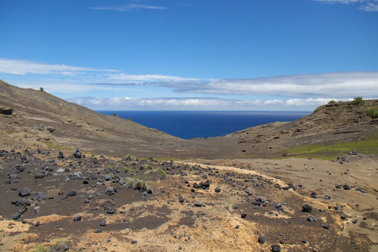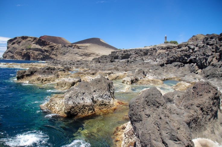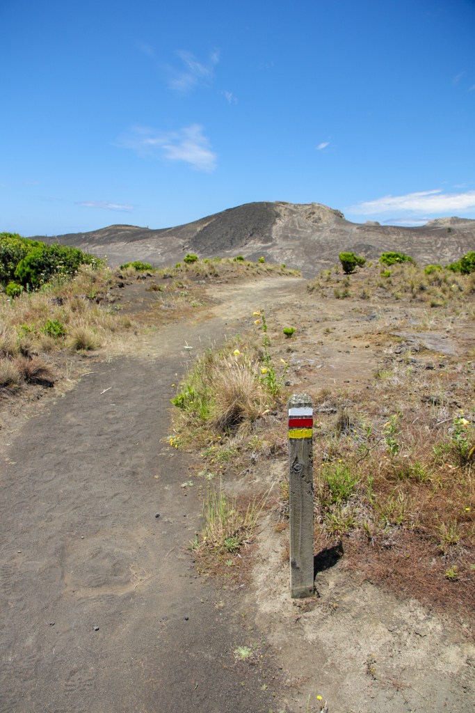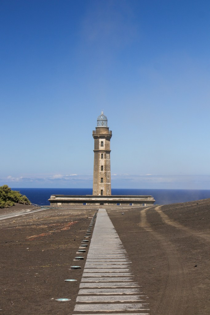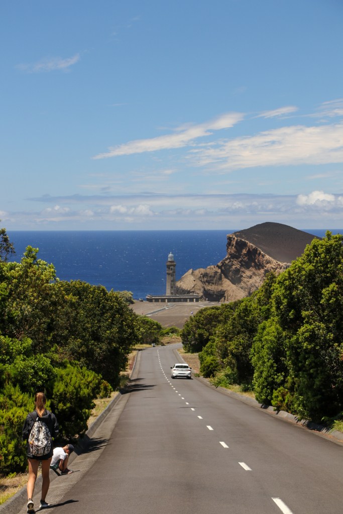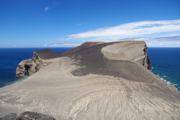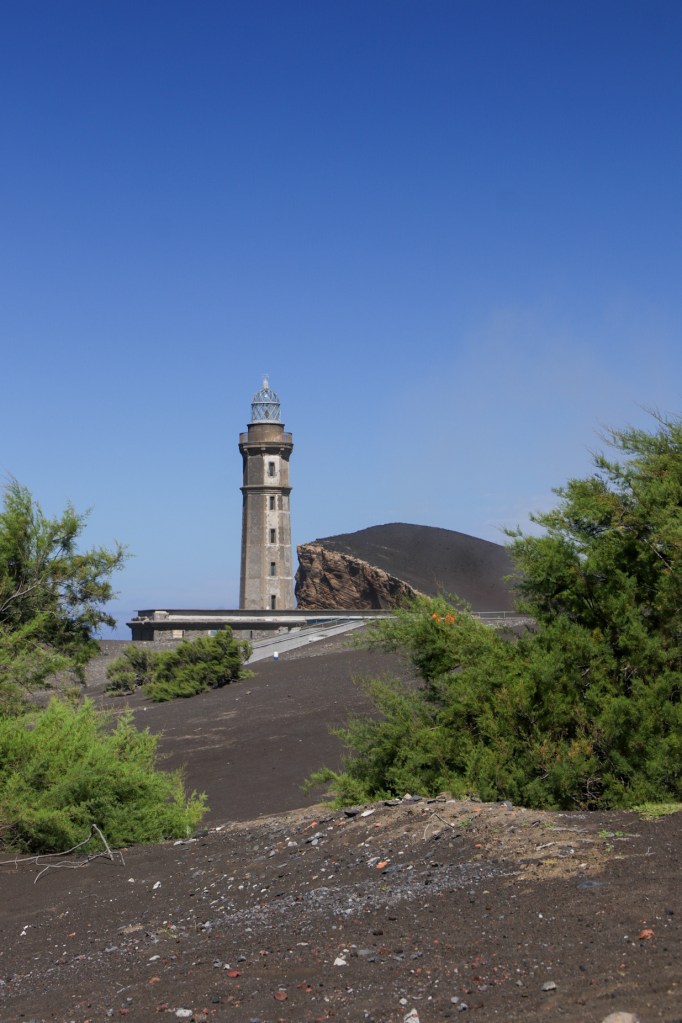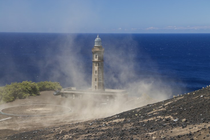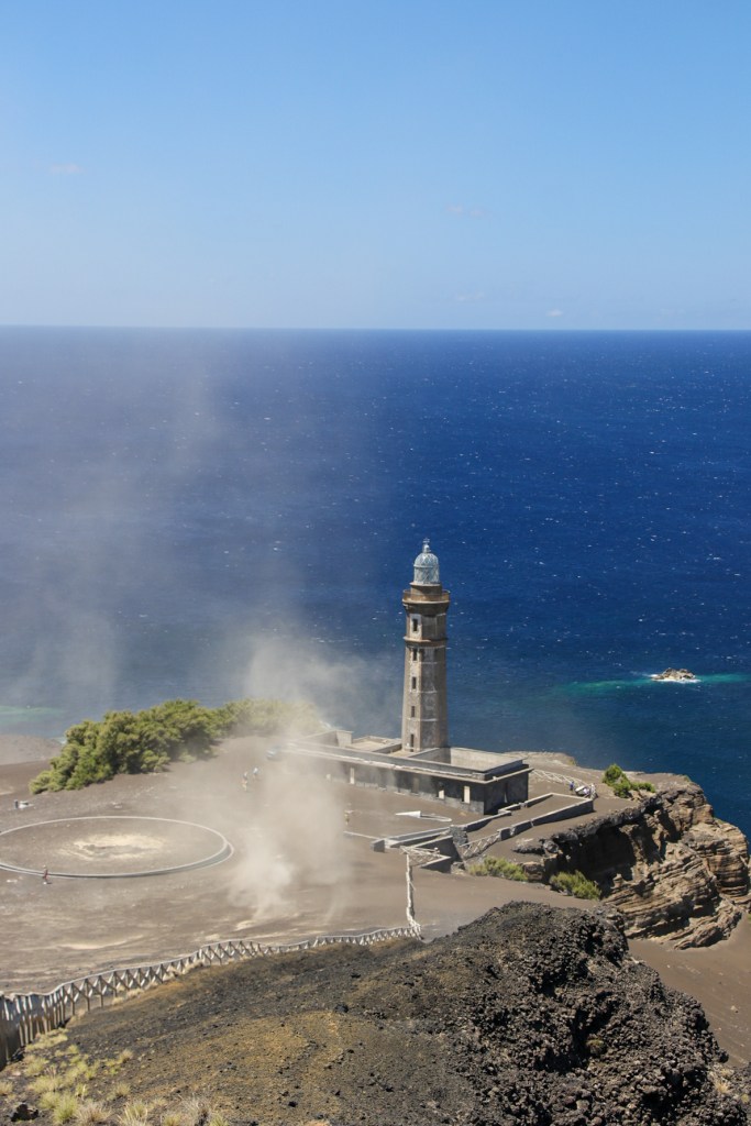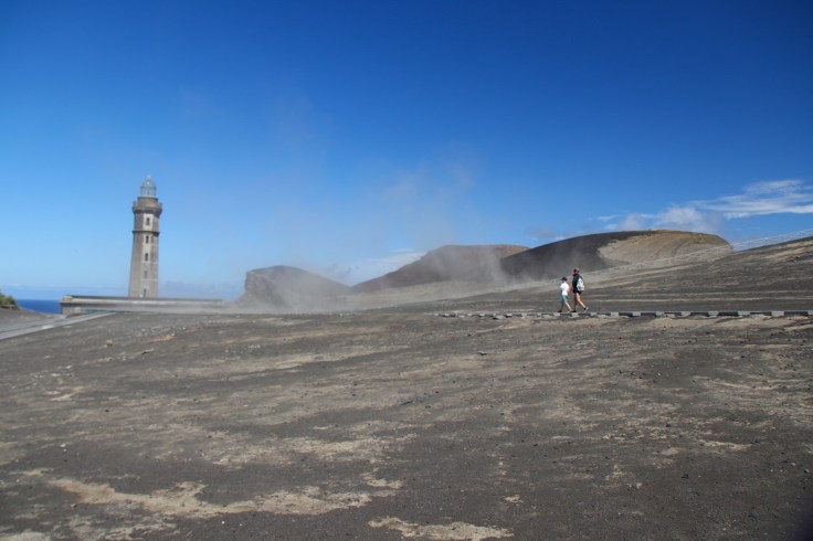 Nach reichlich Viewpoints und immer noch keiner Walsichtung nahmen wir uns dann mal den verantwortlichen Vulkan Capelinhos vor, um mit ihm ein Wörtchen über seine zerstörerischen Kräfte zu reden. Und direkt bei Ankunft auf dem Besucherparkplatz erkennt man, dass das alles noch nicht so lange her sein kann. Denn vor uns tat sich eine Mondlandschaft in schwarz, grau und rot auf. Hier hatte sich das Grün noch nicht zurückgekämpft. Überall bedeckte noch Asche den Boden. Dank dem heutigen Wind bildeten sich im Minutentakt Windhosen und Staubwirbel. Am Ende der eigentlichen Insel trohnte der Leuchtturm und vor ihm lag nun seit 1957 eine neue Halbinsel. Hier war der Vulkan dem Ozean entsprungen und bildete neues Land. Mit einer Markierung per Fahne hat dann Portugal noch während des Ausbruchs seinen Anspruch auf dieses Land geltend gemacht.