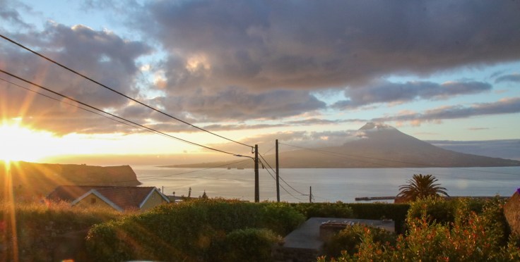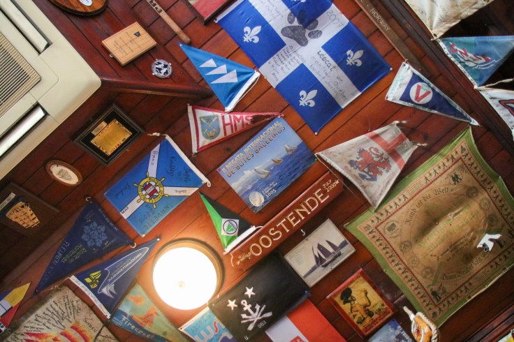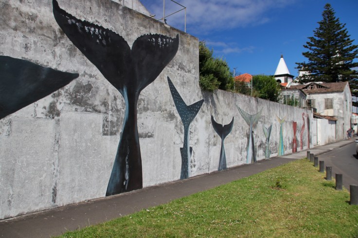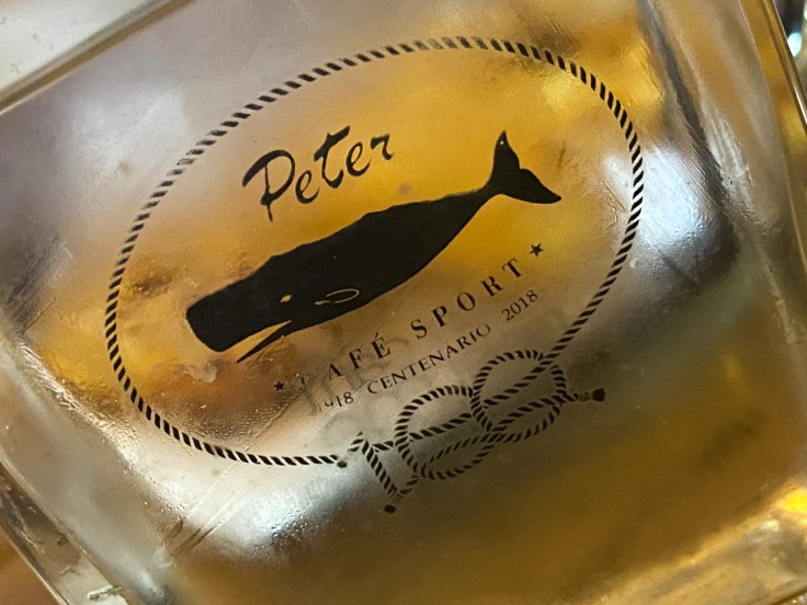 Dennoch kam ich ganz schön kaputt am Auto an und war dankbar, dass dort ein Kanister Wasser für meinen Abhängigkeitstag wartete. Den feierten wir dann auch gleich alle mit einer aufgefüllten Flasche auf Ex. Und weiter ging es zu einem Ziel, das uns schon in Lissabon empfohlen wurde. Genauer gesagt, hat uns eine Dame vom Sicherheitscheck am Flughafen „Peters Sportsbar“ empfohlen. Lt. Reiseführer die berühmteste Kneipe im Atlantic. Das müssen wir förmlich checken. Gefunden ist sie in Horta recht schnell, denn mittlerweile ist es nicht nur mehr eine Kneipe, sondern auch ein Souvenirshop und ein Ausflugscenter und das Ganze ziemlich zentral am Hafen. Also rein in die von Schiffsfahnen dekorierte Kneipe mit Flair. Zuerst ein Bierchen, wobei wir die Frage des Kellners überhaupt nicht verstanden: „Big, medium or small?“. Wie kann man nur so eine Frage stellen an meinem Abhängigkeitstag für Getränke (hab ich spontan vom Wasser erweitert) bzw. Dröhnchen’s Unabhängigkeitstag. Natürlich „very big“. Doch in der Kneipe gab es nicht nur gutes Bier und leckeren Gin, sondern auch wirklich leckeres Kneipenessen. Ein herrlich anstrengender Tag für uns und jetzt unsere Bäuche.