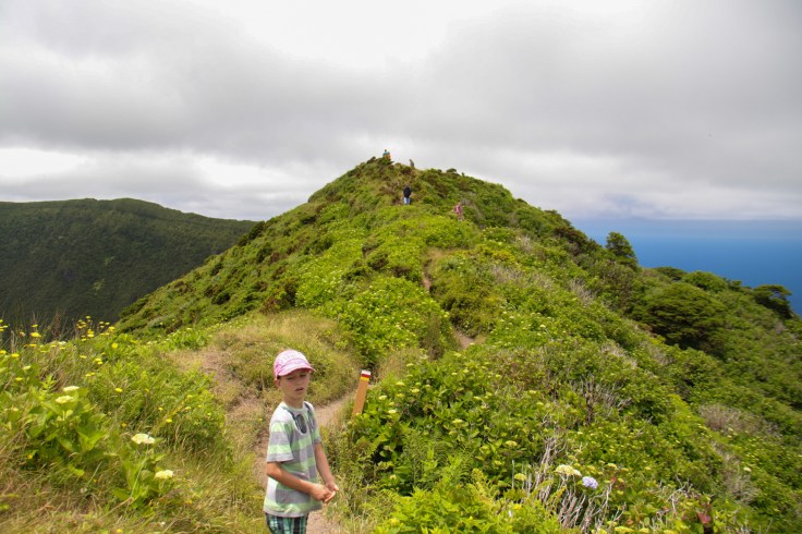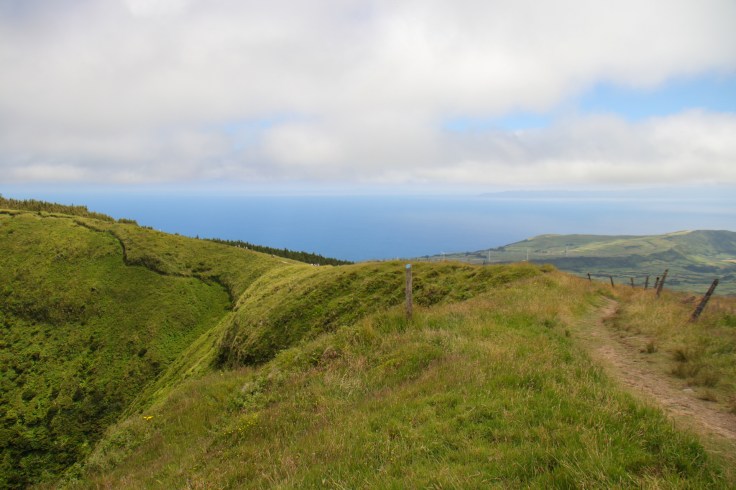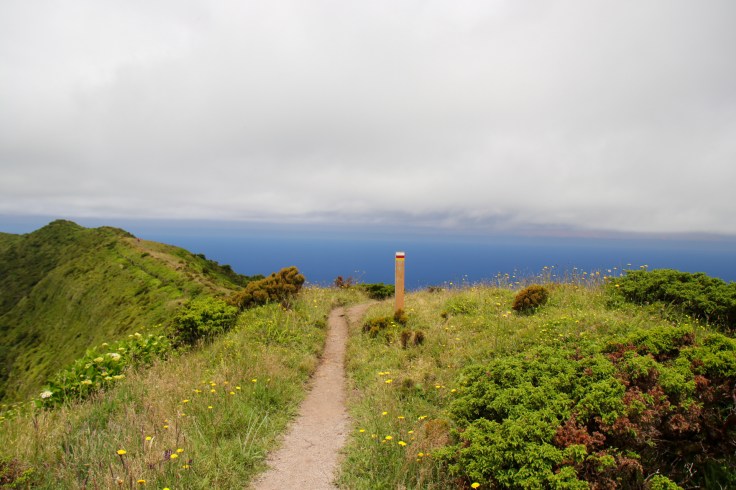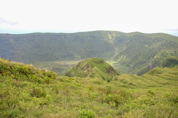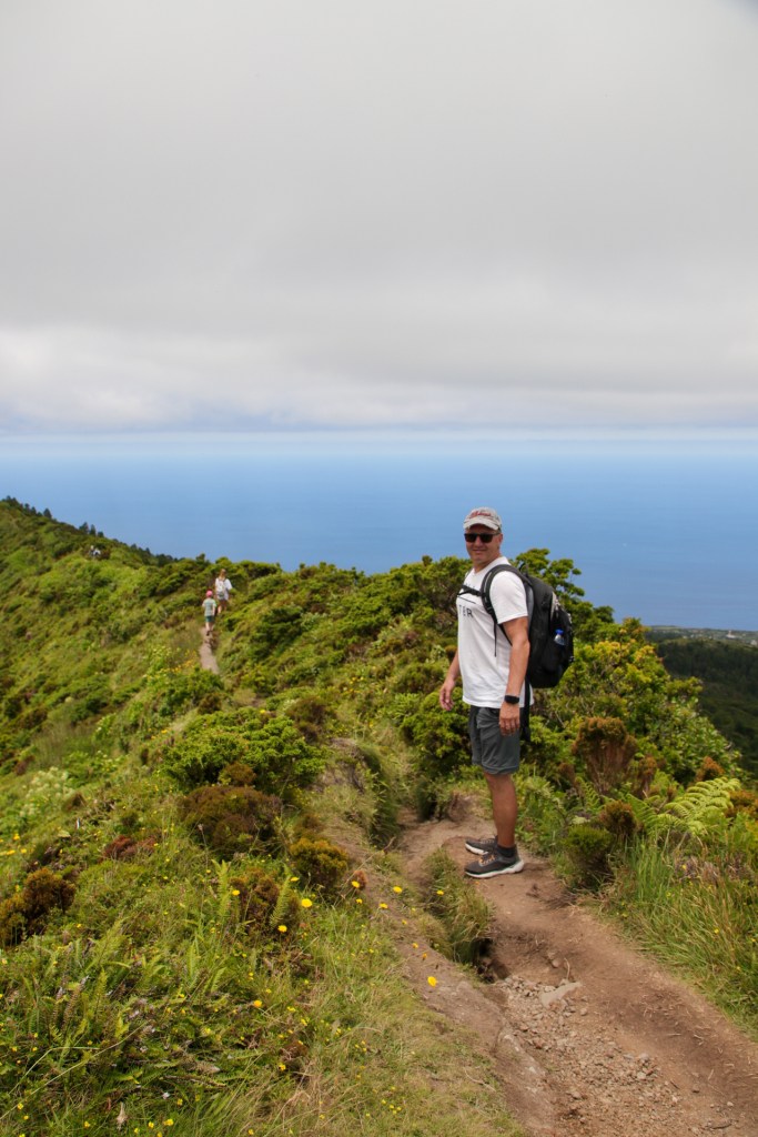 Wenigstens waren wir inzwischen auf der Schattenseite des Kraters und das half auch etwas gegen die drohende Austrocknung. Allerdings zog sich der Weg nun in die Länge wie so ein Kaugummi. Kennt ihr das noch, wenn Eure Eltern Euch als Kinder motivieren wollten: „Wir sind gleich da, hinter der nächsten Kurve ist….“? Und es dauerte nicht nur eine Kurve, sondern Dutzende bis man ankam? Genauso war es nun. Swen motivierte mich mit: „Das ist wirklich die letzte Steigung und danach geht es nur noch bergab.“, nur um mich nach 50 Metern feststellen zu lassen, dass gleich noch eine Steigung folgt. Aber was erträgt man nicht alles, wenn man schöne Aussichten wie diese genießen will. Und die Aussichten waren fantastisch, sowohl in den grünen Krater, als auch Richtung Meer. Und auch wenn ich jetzt jammere, was ich gerne tu, so kann ich doch unumwunden zugeben, dass es eine lohnende Schindung der Füße war.