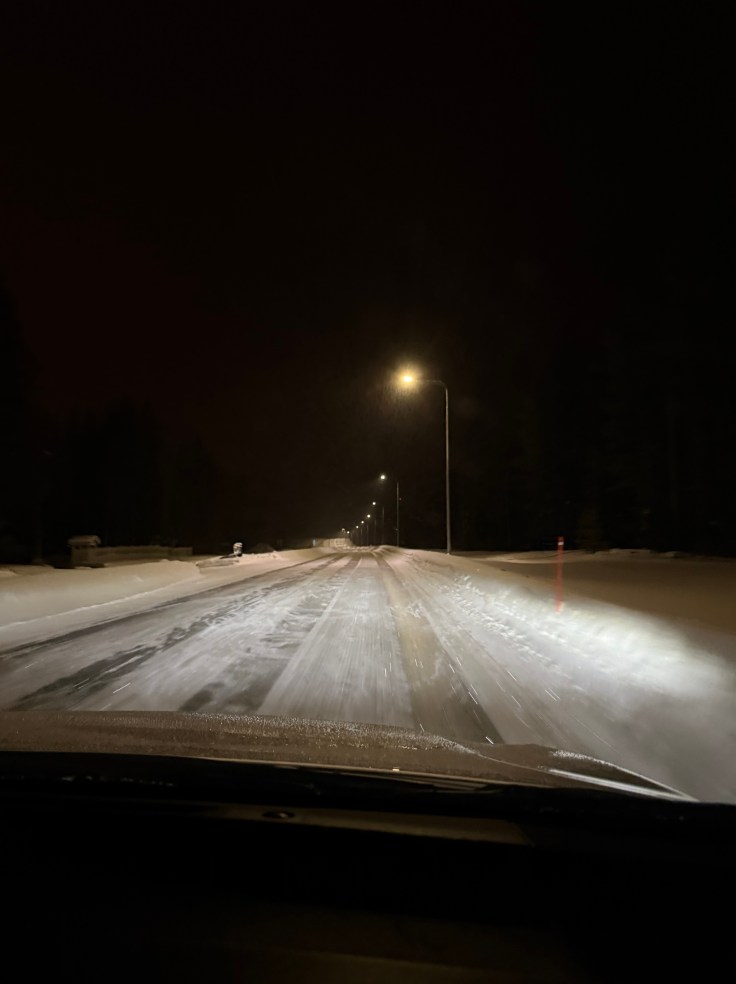 Und dann lagen noch 160 km auf verschneiten, teils vereisten, wenig geräumten Landstraßen vor uns, die nur alle Nase lang mal ein Dorf mit 3 Häusern kreuzten und dann auch Straßenlaternen aufwiesen. Unser Kotzbeutelchen schlief sich auf dem Rücksitz gesund und wir versuchten die Augen offen zu halten, sämtliche Elche und Rentiere schon vor der Geburt oder Straßenüberquerung zu erspähen und den richtigen Weg zu finden. Natürlich spähte ich auch hi und da nach Nordlichtern, aber offiziell unterstützte ich meinen Mann bei der Einschätzung der Wege. Bis ich plötzlich im Osten etwas sehr, sehr Helles am Horizont entdeckte. Es sah aus wie ein Sonnenaufgang über den Wäldern, die tief verschneit sind. Faktisch gar nicht möglich, weil es so dunkel wie in einem Rentierarsch war. Aber es leuchtete so hell, dass ich verwirrt Swen auf meine Sichtung hinwies. Es hätte ja schließlich wirklich eine verwirrt aufgehende Sonne oder ein Ufo oder sogar der Weihnachtsmann sein können. Aber nein, es war nur der fast volle Mond, der meine Synapsen verwirrte. Ich glaube, hier war ich dann auch bereit für die finale Phase unserer Reise. Endlich ankommen, ein Bierchen und ein Bettchen. Mal sehen wie es tagsüber hier aussieht?