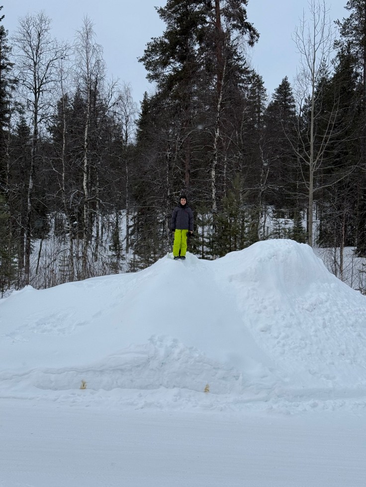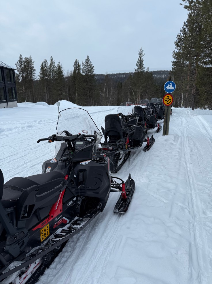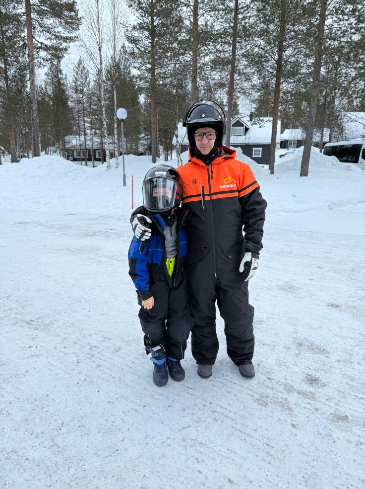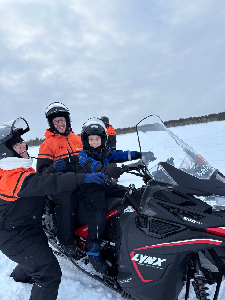 Wir jedenfalls hatten für heute unser erstes Highlight geplant und wollten mit dem Snowmobile eben durch diesen wunderbaren Schnee. Gott-sei-Dank ging es Georg nach der gestrigen Tortour wieder gut und uns immer noch. Hoffen wir einfach mal, dass es kein Feriengeschenk aus der Schule war, sondern wirklich nur ne Unverträglichkeit. Jedenfalls waren wir stabil genug, um uns den gesamten Kofferinhalt gleichzeitig anzuziehen. Bekanntlich soll es ja verdammt kalt in Finnisch Lappland sein. Also gab es einen Zwiebellook, der mich tatsächlich aussehen ließ, wie eine kleine runde Zwiebel. Dazu noch 2 paar Handschuhe und die von der Nachbarin geborgten finnlandtauglichen Schuhe. Bis ich alles anhatte war mir so warm, dass ich sofort wieder alles ausziehen wollte. Da half es auch nicht, sich so als Michelinmännchen verkleidet in ein beheiztes Auto zwingen zu sollen. Ist ungefähr so, als wenn man mit 100 Heliumballons versucht, in einen Trabbi zu steigen. Ich befürchte, wir haben es Kleidungstechnisch übertrieben. Da hilft es auch nicht, wenn die bei unserer Snowmobiletour uns nach unseren Schichten fragen und sicherheitshalber nochmal einen Schneeanzug obendrauf empfehlen. Falls ich bisher noch nicht in den Hitzewallungen der Wechseljahre war, sag ich mal „Herzlich Willkommen Klimakterium“. Einen Skianzug über eine Skihose und eine gefütterte lange Unterhose ziehen, fühlt sich verdammt heiß an, sieht aber für Außenstehende nicht ansatzweise heiß aus. Aber was tut man nicht alles, um dem Kältetod am allerersten Urlaubstag zu entgehen. Wir gaben alles und ich befürchtete schon, dass ich so nie auf ein Snowmobile komme, denn dafür müsste ich ja noch meine Beine heben können. Schon mal ein Michelinmännchen gesehen, dass seine Beine hebt?