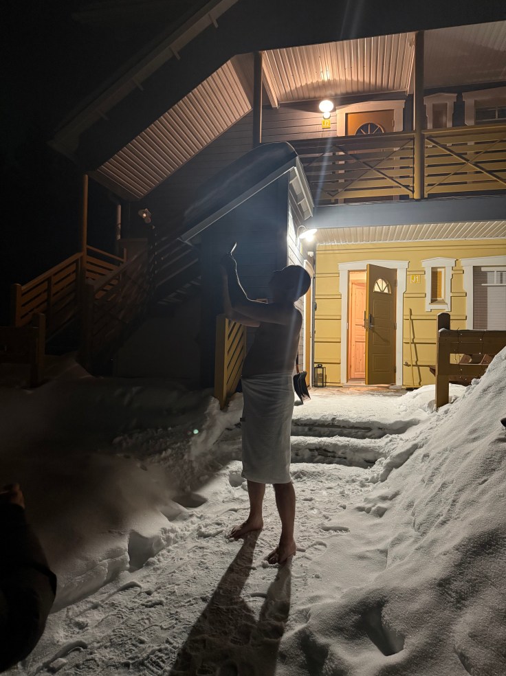 Swen bringt kurz den Vorschlag ein, einen Eimer Wasser in das schön zündelnde Feuer zu gießen. Allerdings bezweifele ich, dass dies das Problem mit dem Qualm nachhaltig lösen wird. Irgendwie zieht der Schornstein nicht. Also reißen wir alle Türen auf, denn Fenster gibt es in Finnland nicht. Auch so eine Erkenntnis, die man erst macht, wenn man wie üblich ein Fenster aufreißen will. Hier gibt es nur Festverglasung und kleine Lüftungsschlitze, die allerdings nicht mit einem Fenster in solch einer Situation konkurrieren können. Also ergreift Swen die einzig sinnvolle Möglichkeit, um uns vor dem Erstickungstod, gefolgt vom Kältetod zu schützen. Er greift sich die Holzzange und damit einen brennenden Scheit nach dem nächsten und rennt damit raus in den Schnee, bis es zischt.