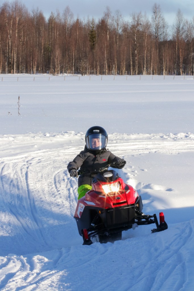 Das Einzige was im Vergleich zu Österreich natürlich fehlt, sind die Alpen. Also dieses riesige Bergpanorama mit unendlich vielen Gipfeln, soweit das Auge trägt. Hier im allergrößten Skigebiet Finnlands hat man genau einen Berg. Der ist genau 729 Meter hoch und damit ungefähr auf Höhe der ersten Apres Ski Bar in den Alpen. Dafür ist er dank der kegeligen Form von allen Seiten befahrbar. Also keine sinnlos langen Bergketten, aber wer braucht das schon. Dafür kann man hier so vieles mehr machen. Wie zum Beispiel Snowmobile fahren.