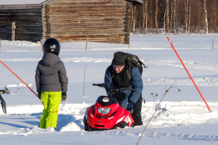 Nach x-Runden kam dann das, was in der Genetik des Mannes tief verwurzelt ist. Nach Routine kommt nämlich immer Übermut. Also wurden die Runden schneller und schneller und die Kurven enger und enger gefahren. Es kam wie es kommen musste, Georg verpasste eine Kurve, landete mit seinem Snowmobile im Tiefschnee und wurde formschön abgeworfen. Das wiederum war für ihn und vor allem mich sehr amüsant. Für mich hauptsächlich deshalb, weil nun Swen die Rettungsmission aus dem Tiefschnee begleiten durfte. Also stapfte er durch den Schnee und verschwand gelegentlich bis zum Oberschenkel im selbigen. Das Snowmobile bekam er nur wieder auf die Fahrbahn indem er zog, wie an einem Ochsenschwanz. Georg stand daneben und schmunzelte noch über seinen Sturz und der Guide gab Swen genaue Anweisungen ohne selbst ins Schwitzen zu geraten. Ach ja, und ich fotografierte. So hatten wir wirklich alle einen schönen Moment, der nur noch getoppt wurde, als Swen seine Stiefel voller Schnee ausleerte.
