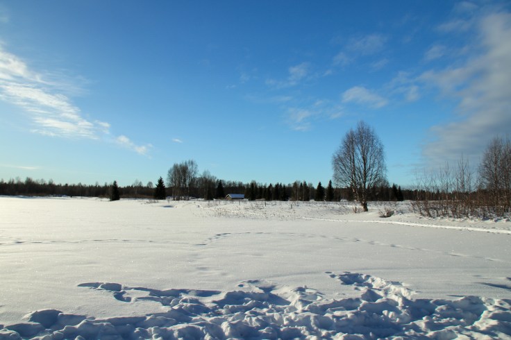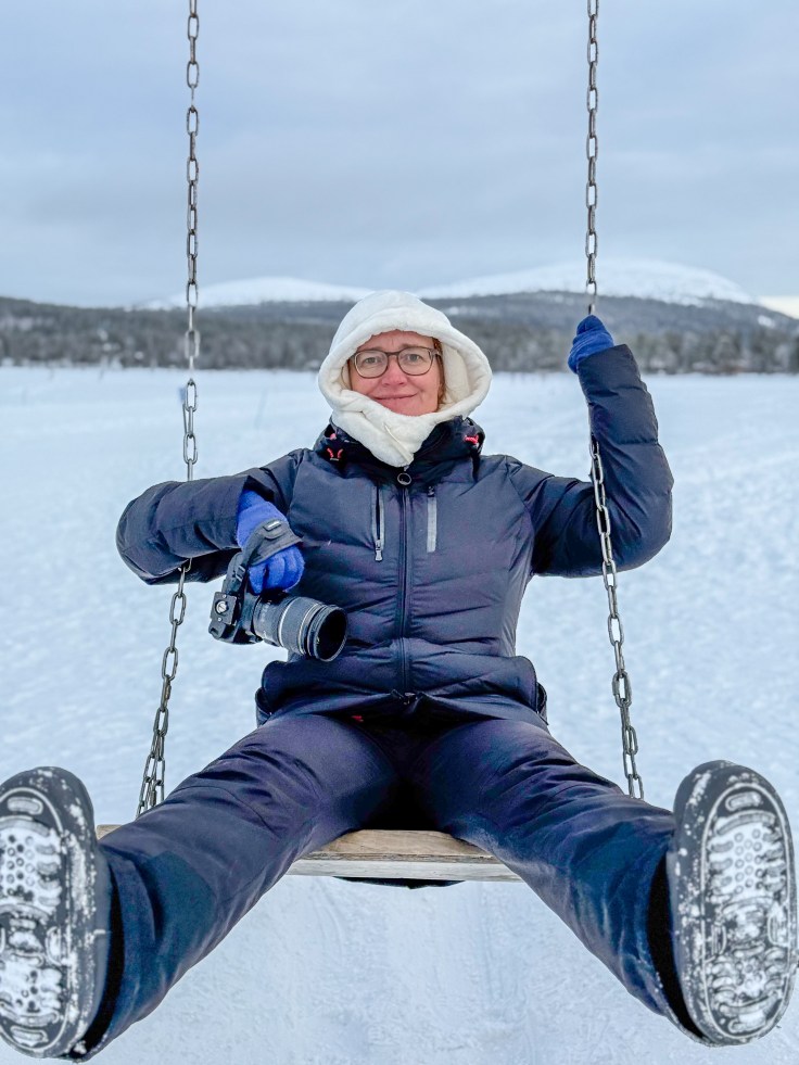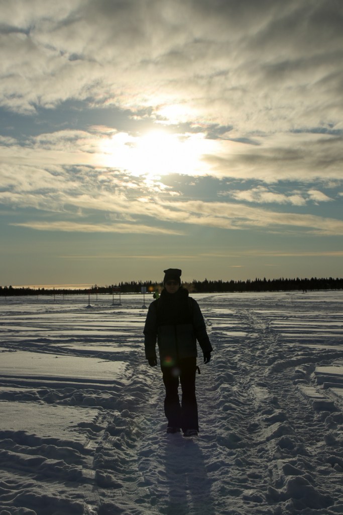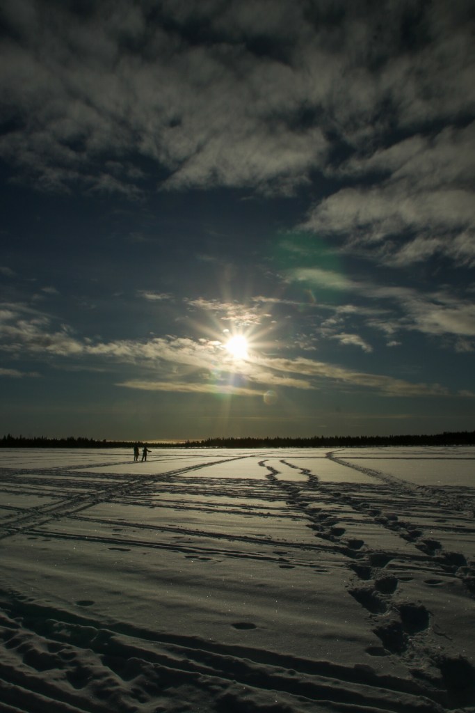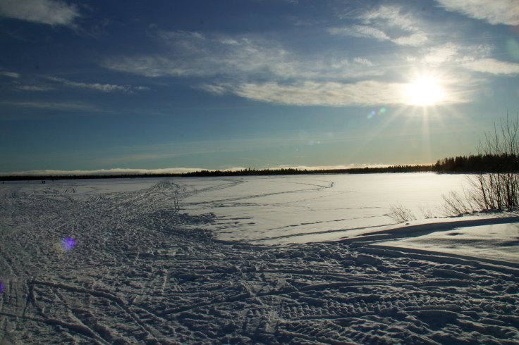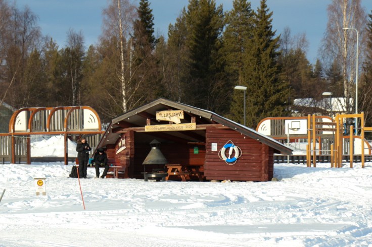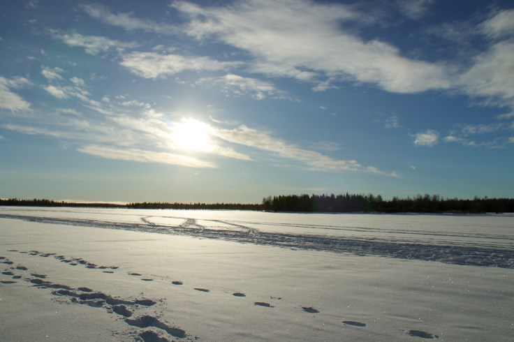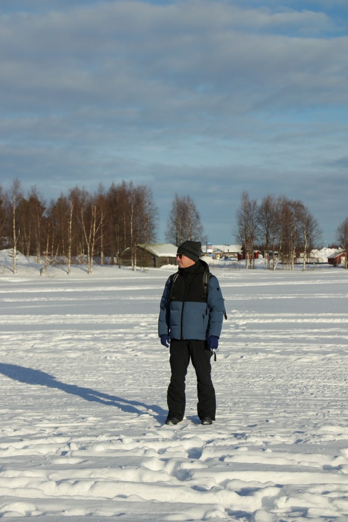 Wir jedenfalls wanderten zum See, der welch Wunder zugefroren war und eine wahrer Highway für Langläufer, Snowmobile, Fatbikes und uns Fußgänger. Nur ein kleines Loch gab es im See und da sprangen kaum bekleidete Saunagänger hinein. Ich sags doch, die Finnen spinnen.