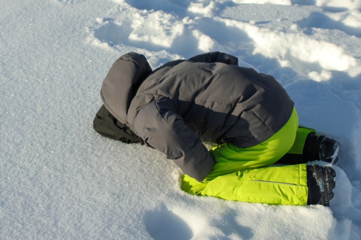 Eigentlich wollten wir auch noch eine Schneeballschlacht machen, aber der Schnee ist hier so trocken, dass einfach nichts zusammenklebt. Da hilft halt nur Kopfüber in den Schnee dippen, was mindestens genauso Spaß macht.