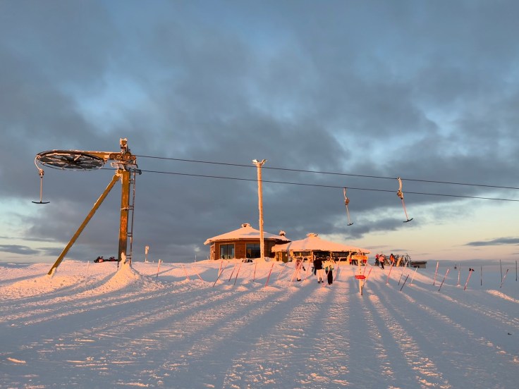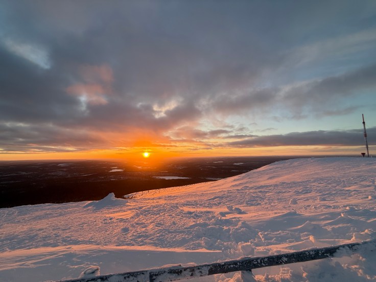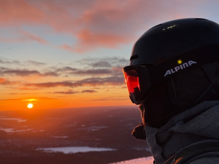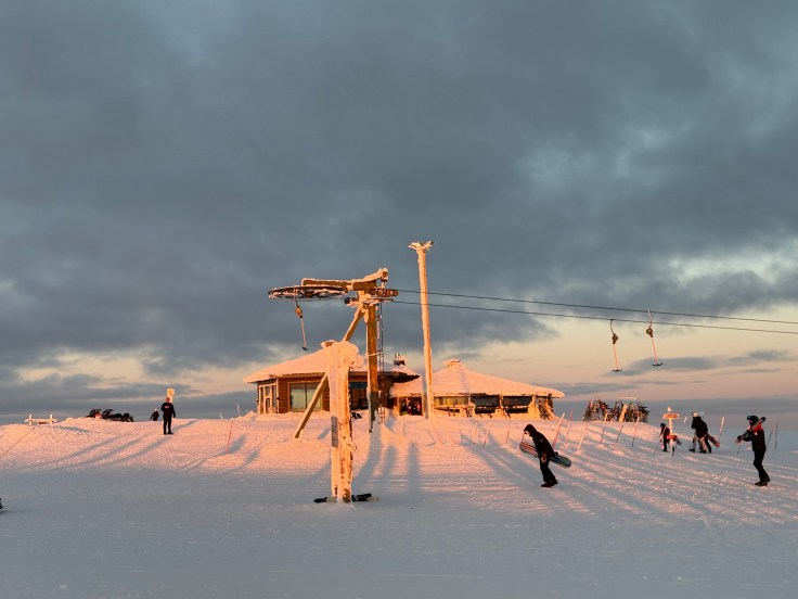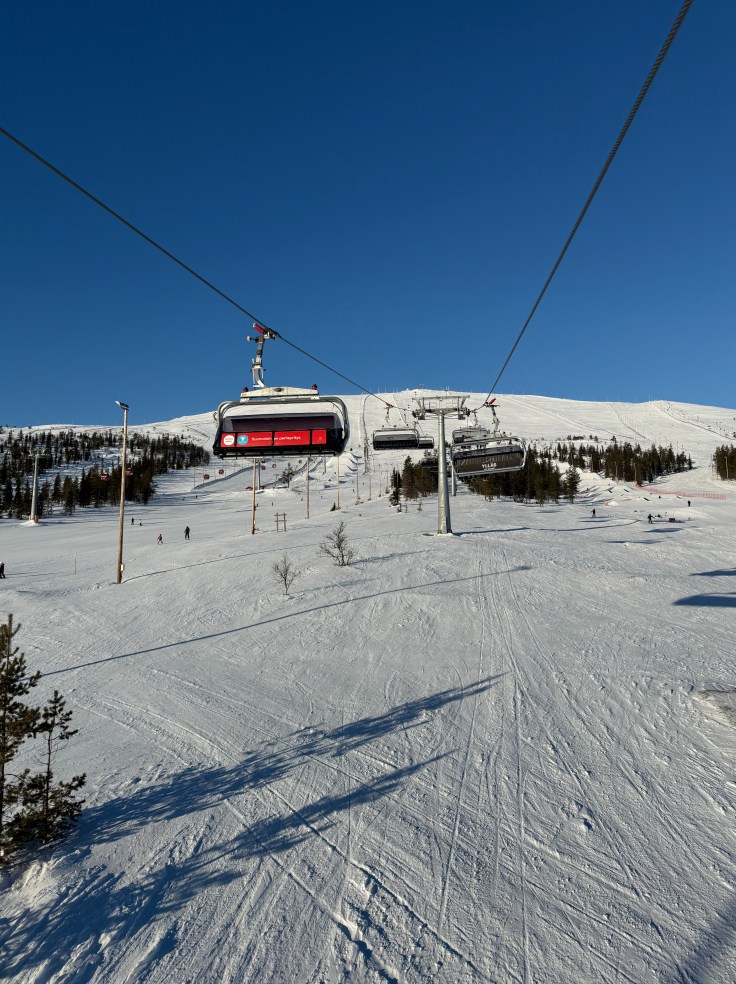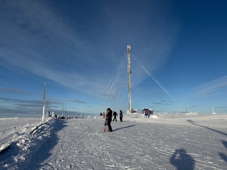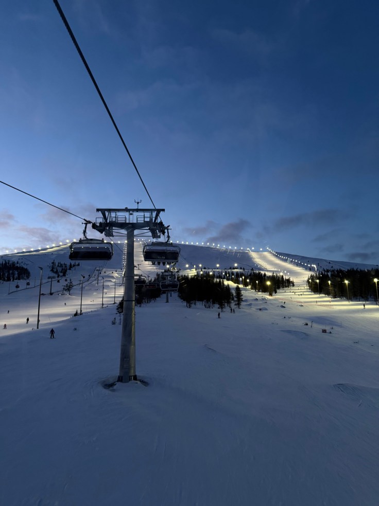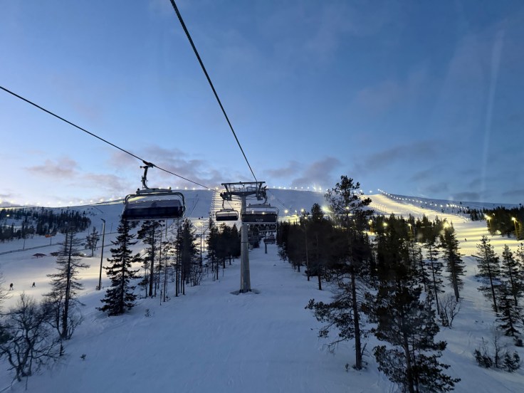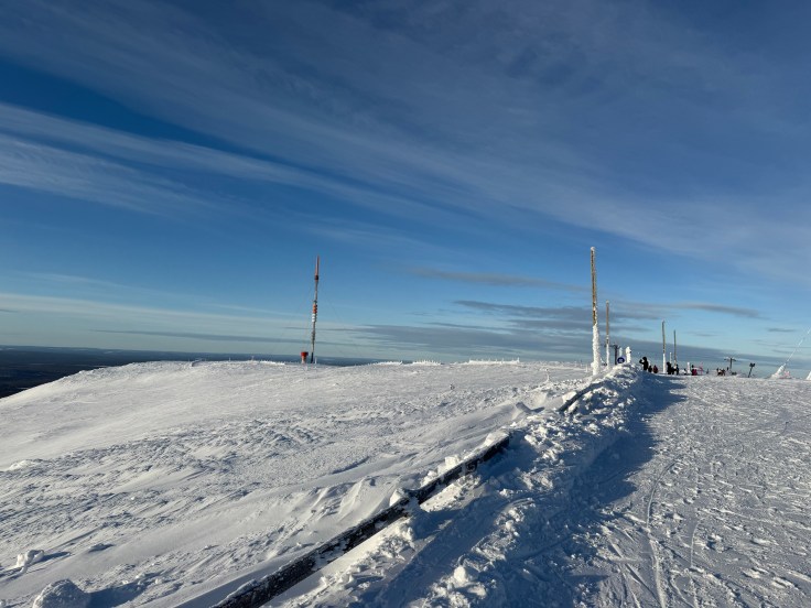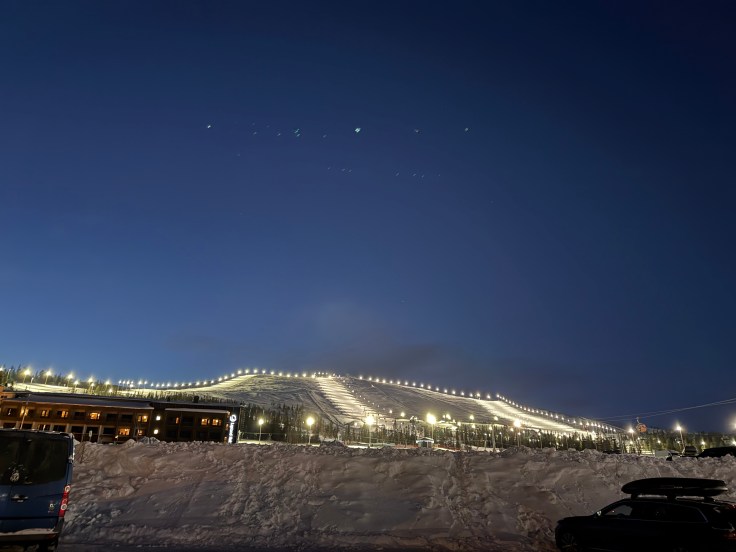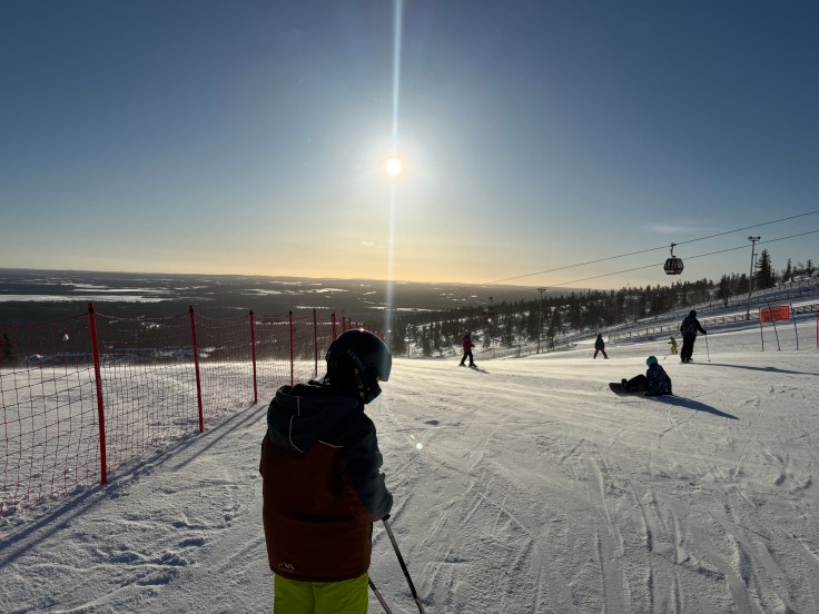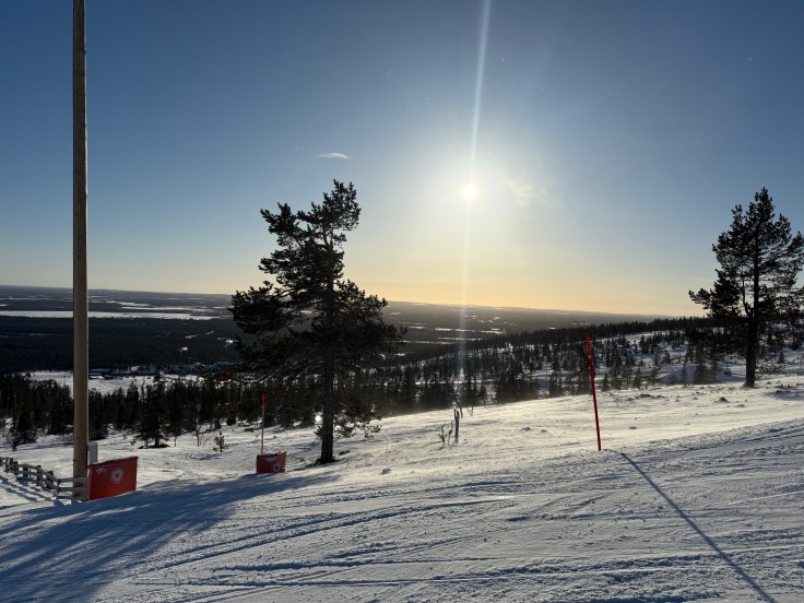 Heute war es dann endlich soweit, es ging auf die finnische Piste. Angesichts der Tatsache, dass der „Berg“ hier nur 719 m misst, konnte ich auch relativ entspannt an die Sache rangehen. Trotzdem hatte ich eine gewisse Nervosität in mir. Schließlich ist es zwei Jahre her, dass ich Bretter unter meinen Füßen hatte und beim letzten Mal endete mein Skiabenteuer im Krankenhaus. Also war ein wenig Aufregung durchaus angebracht gewesen. Doch ich sah den Hang und die breiten Pisten mit verhältnissmässig wenigen Menschen und dachte, dass könnte schön werden.