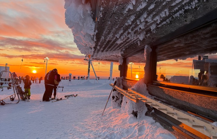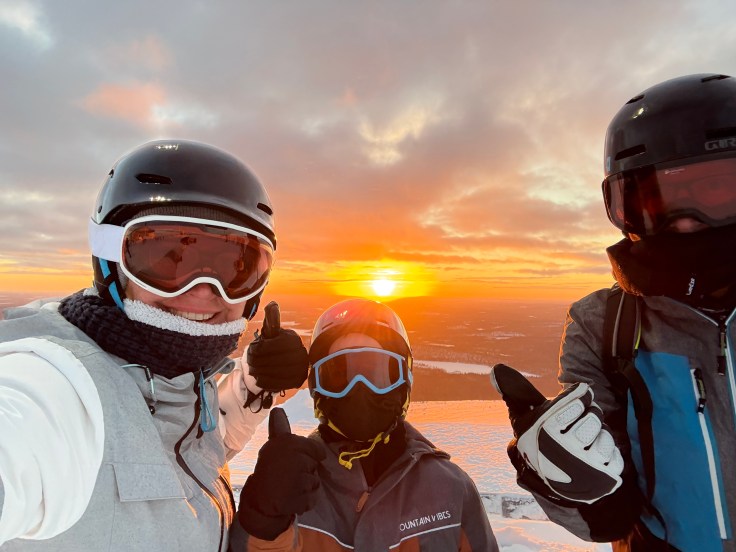 Nachdem wieder alle Gliedmaßen aufgetaut waren, hosten wir unsere zwanzig Schichten wieder an und nahmen gegen 16:00 Uhr Angriff auf die lange Schlange zur Gondel. Nur die Gondel fährt bis ganz auf die Bergspitze. Während wir auf halber Höhe schon Angst vor Frostbeulen hatten, so kann ich kaum beschreiben, wie es sich anfühlte, als wir am Gipfel die Gondel verließen. Gefühlt waren wir hier bei -30 Grad und der Wind pfiff um unsere Helme. Allerdings war das Frostgefühl einem ganz anderen gewichen, denn wir kamen pünktlich zum Sonnenuntergang oben an und sprinteten Richtung Sonne, die langsam am Horizont verschwand und den ganzen Himmel orange färbte. Jeder Stock hier oben, jeder Mast, jedes Gebäude war eingehüllt von einer dicken Eisschicht und doch färbte die Sonne alles in ein herrlich warmes Orange. So etwas Schönes hatten wir alle drei nicht erwartet und fotografierten bis der Handyakku ob der Kälte streikte.