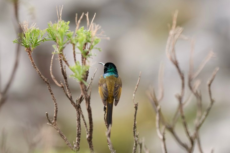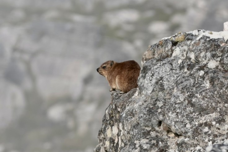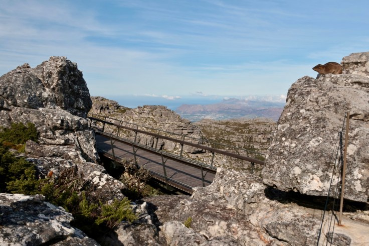 Doch nach ca. einer Stunde hatten wir es geschafft und durften mit der Seilbahn auf die Tafel. Noch wolkenlos gab es eine einfach atemberaubende Aussicht. Und Georg zeigte mit der allerersten Tiersichtung, nach meinen Pappmache-Sichtungen, dass er genetisch von mir abstammt. Er entdeckte eine Echse in Blau. Danach dann auch noch den ersten Klippschliefer, der zwar genetisch dem Elefanten ähneln soll, aber eher so wie ein Meerschweinchen rüber kommt. Danach kam dann die erste Sichtung meines Mannes, in Form eines wunderschönen Vogels und ungefähr als 380.te hatte ich die erste Sichtung eines sehr statischen Klippschliefers, den Georg übersehen hatte.