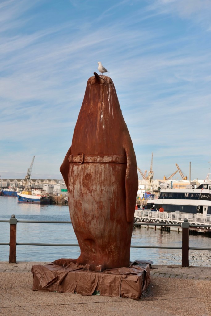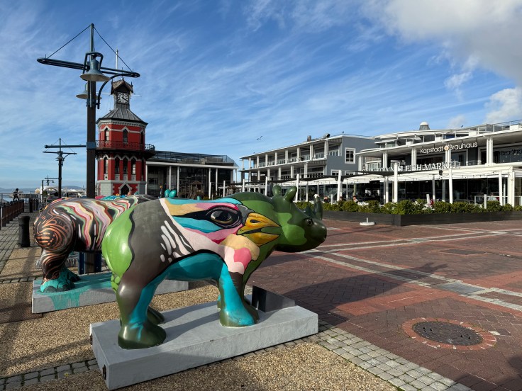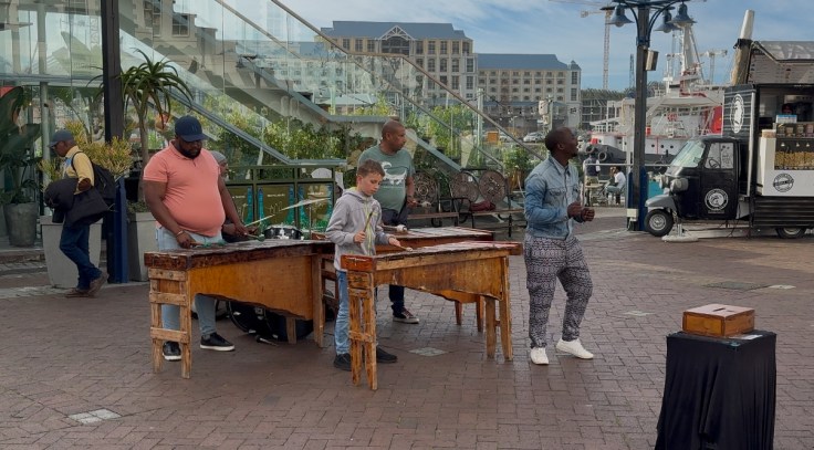 Mit dem Bus ging es die Küste entlang, vorbei an fantastischen Stränden, vornehmen Wohngegenden, Palmen und Aussichten. Ein Fleckchen Erde zum niederknien, wenn man nicht gerade Bus fährt. Wir jedenfalls knieten gedanklich nieder und fuhren bis zur Waterfront, wo uns Shopping bis zum Abwinken erwartete. Daneben gab es unzählige Straßenkünstler, -Combos und -Ensembles, die in irgendeiner Weise die afrikanische Kultur präsentierten. Und wenn Georg zu Hause auch zurückhaltend und beschämt ist, so ließ er sich hier nicht zweimal bitten und brauchte noch nicht einmal einen elterlichen Schubser, um in die erst beste Band mit Balafon (bitte googeln) einzutreten und aktiv mitzumachen. Was macht Afrika nur mit uns steifen, langweiligen Europäern? Ich verstehe es nicht. Der hat sogar mitgetanzt und wollte gar nicht wieder aufhören. Und ja, wir haben für seinen 18. Geburtstag das passende Videomaterial natürlich aufgenommen. Sind ja keine Rabeneltern.