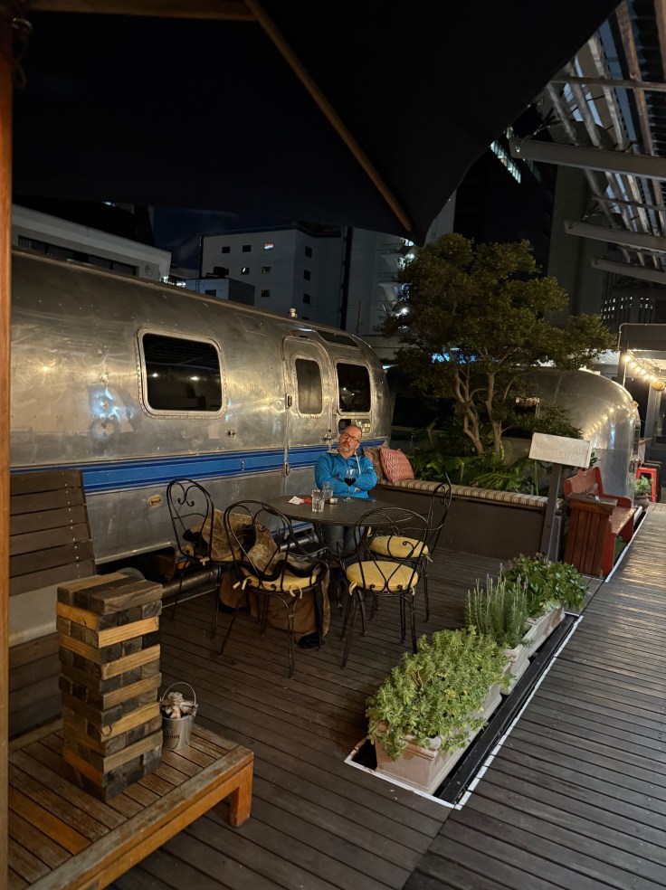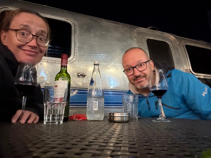 So aßen wir ein erstes südafrikanisches Hoteldiner und wollten uns mit letzten Kräften auf unser Hoteldach schleppen. Doch Georg war schon so müde und verpeilt, dass er die Glastür vom Restaurant-Eingang übersah und knallend dagegen lief. Ein Gefühl zwischen Schmerz, Peinlichkeit und Scham überkam ihn und er rannte gleichzeitig heulend und lachend die Treppe hinauf. Ich wäre dafür, dass übergroße Burger an die Scheibe geklebt werden, oder Elefanten, oder Airstreams….