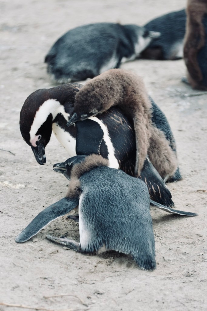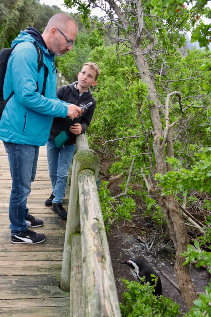 Da wir hier in Reichweite der Antarktis sind, ist es nur verständlich, dass man hier auch auf Pinguine treffen kann. Eisbären dagegen sind äußerst unwahrscheinlich, wie ich schon in der Schule gelernt habe. Am Boulders Beach befindet sich dann gleich mal eine riesige Kolonie. Und kaum hatten wir geparkt, zeigte uns der selbsternannte Parkplatzwart gleich die ersten 2 Pinguine im Gebüsch. Ich schätze einfach, seinen ersten Pinguin vergisst man nie. So muss es sich für meinen aufgeregten Georg angefühlt haben. Einfach nur süß, wie aufgeregt er war und ab da jeden Pinguin in Foto und Video festhielt. An alle, die mit ihm per Telefon verbunden sind, entschuldige ich mich schon jetzt dafür, dass er sie mit tausenden Bildern und Video’s zuspamt.