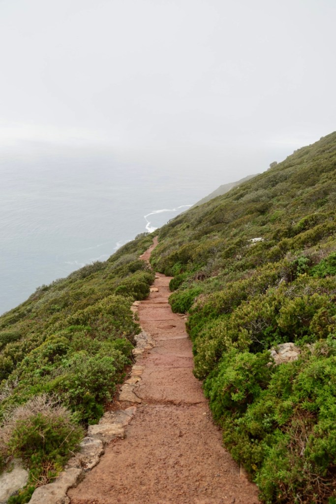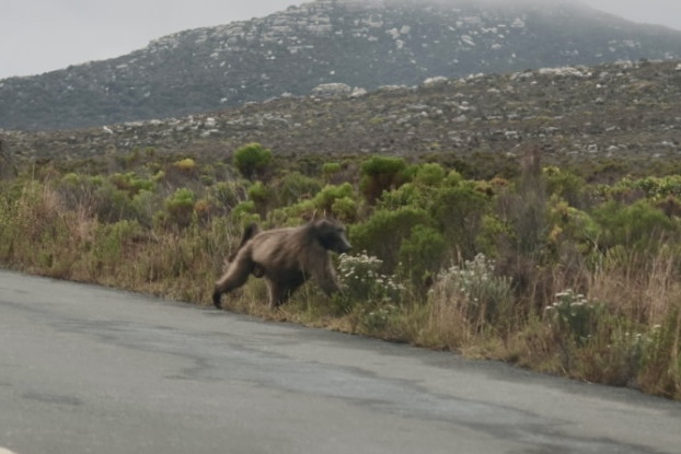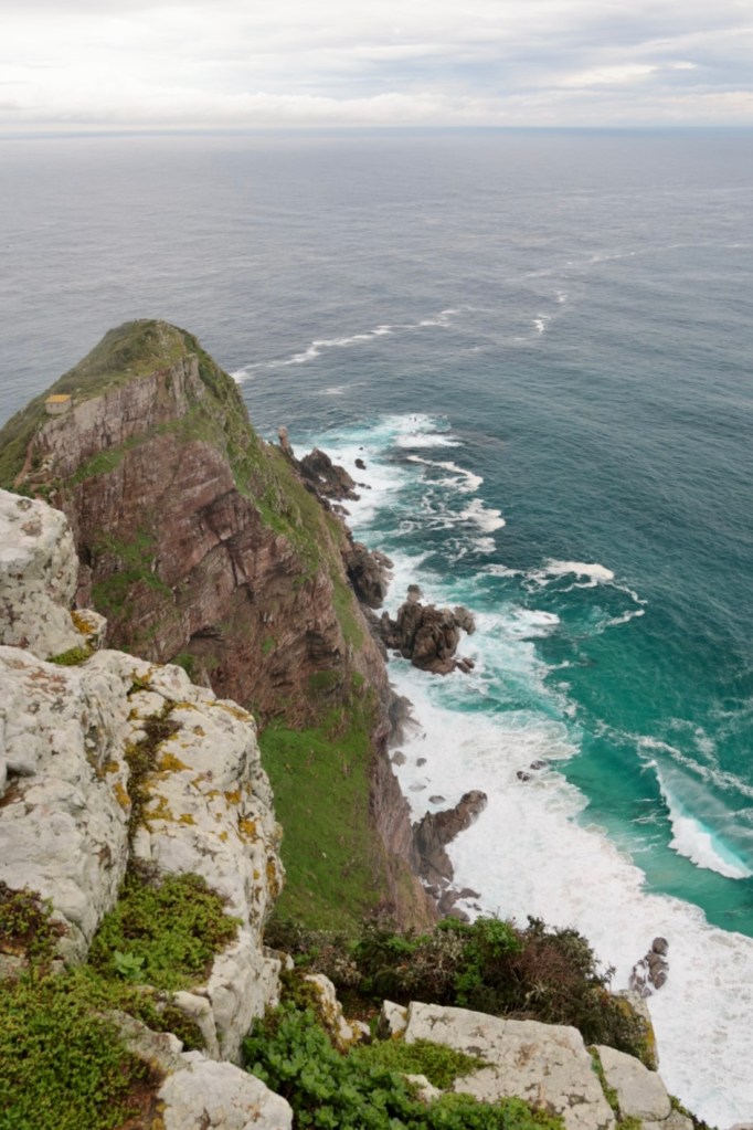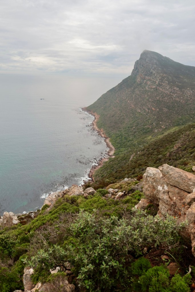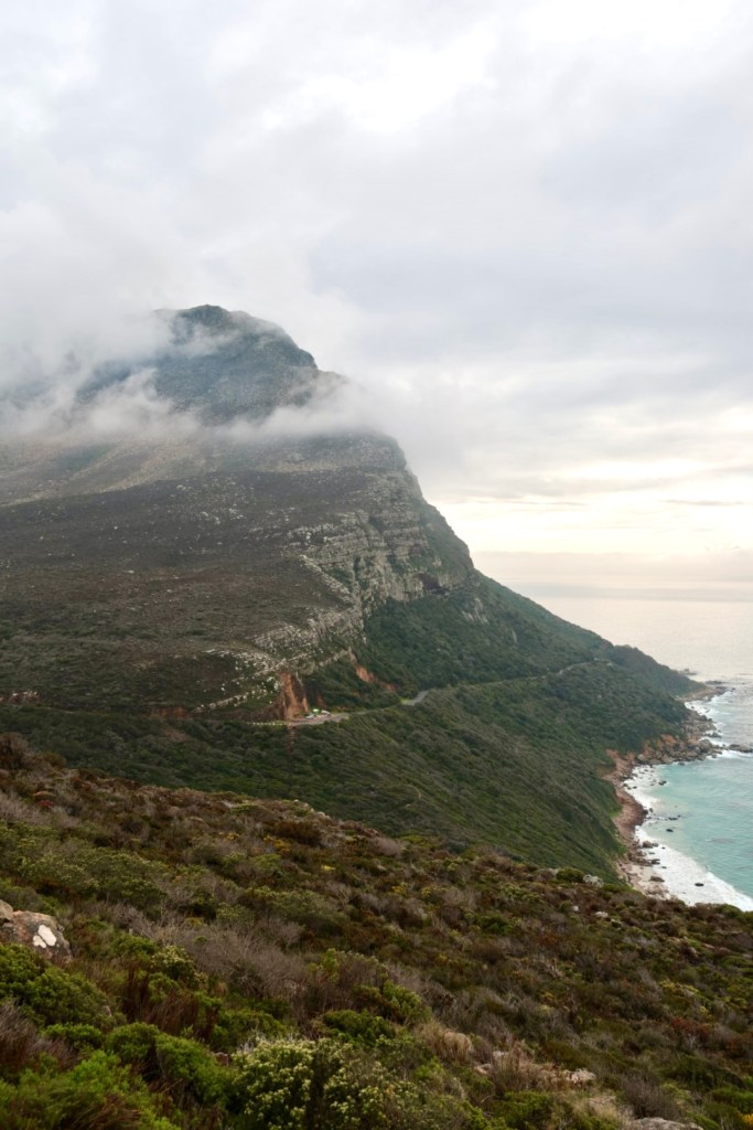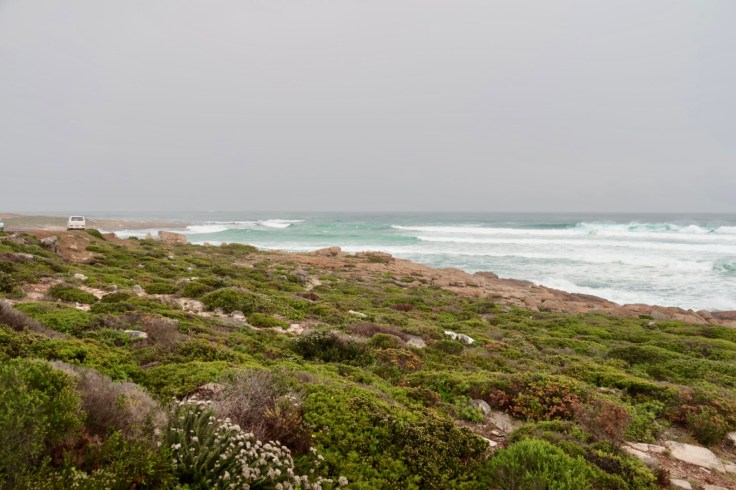 Zuerst fuhren wir ziemlich einsam über die Hochebene der Kapregion, die irgendwie aussah wie der Vorgarten von Mordor. In dem Schittwetter sicherlich noch mal eine Spur mystischer und verlassener, als bei Sonnenschein. Überall wuchsen und blüten Protea’s und andere sturmerprobte Gewächse. Keines höher als 1-2 Meter, obwohl alles fruchtbar und lebensbejahend erscheint. Das mag wohl an dem ewig pfeifenden Wind hier über dem Hochplateau liegen.
