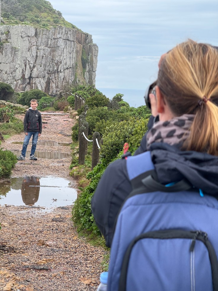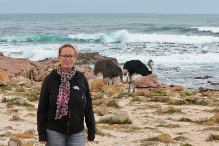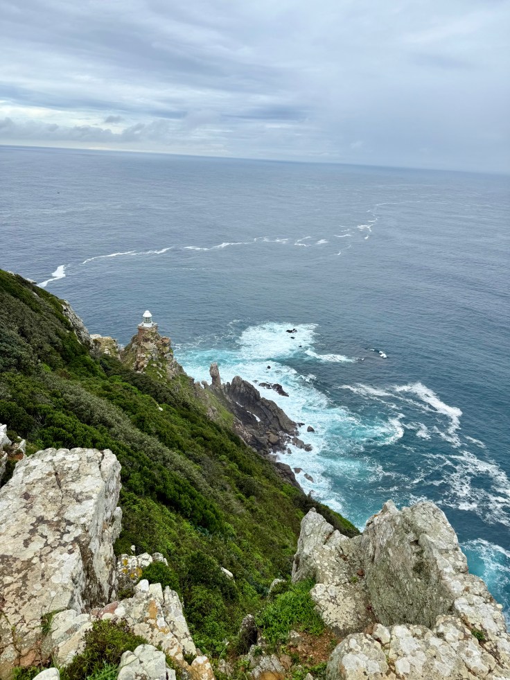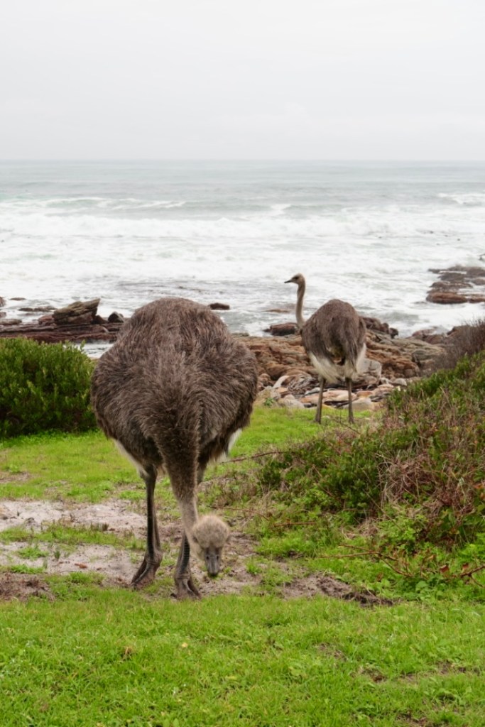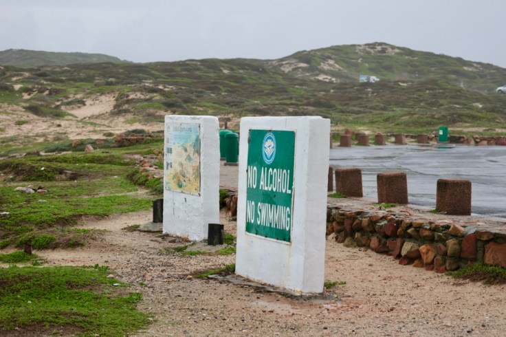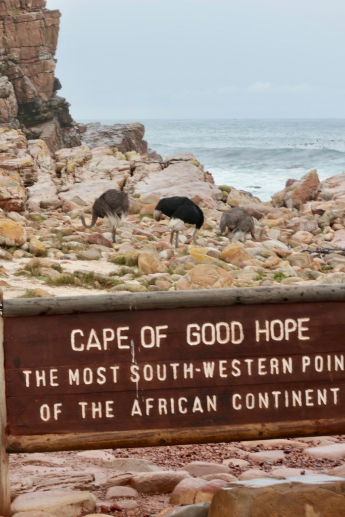 Aber wir beschlossen beim Frühstück mit Traumblick ins Einheitsgrau, dass wir trotzdem Richtung Cap fahren wollten. Gesagt getan und ab zum südwestlichsten Punkt von Afrika. Da war ich schon vor 18 Jahren und textete gleich mal meine Mitreisenden zu, was es da alles gibt: eine Wanderung, viel Wind, Strauße und eine tolle Küste.