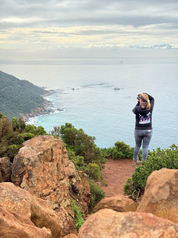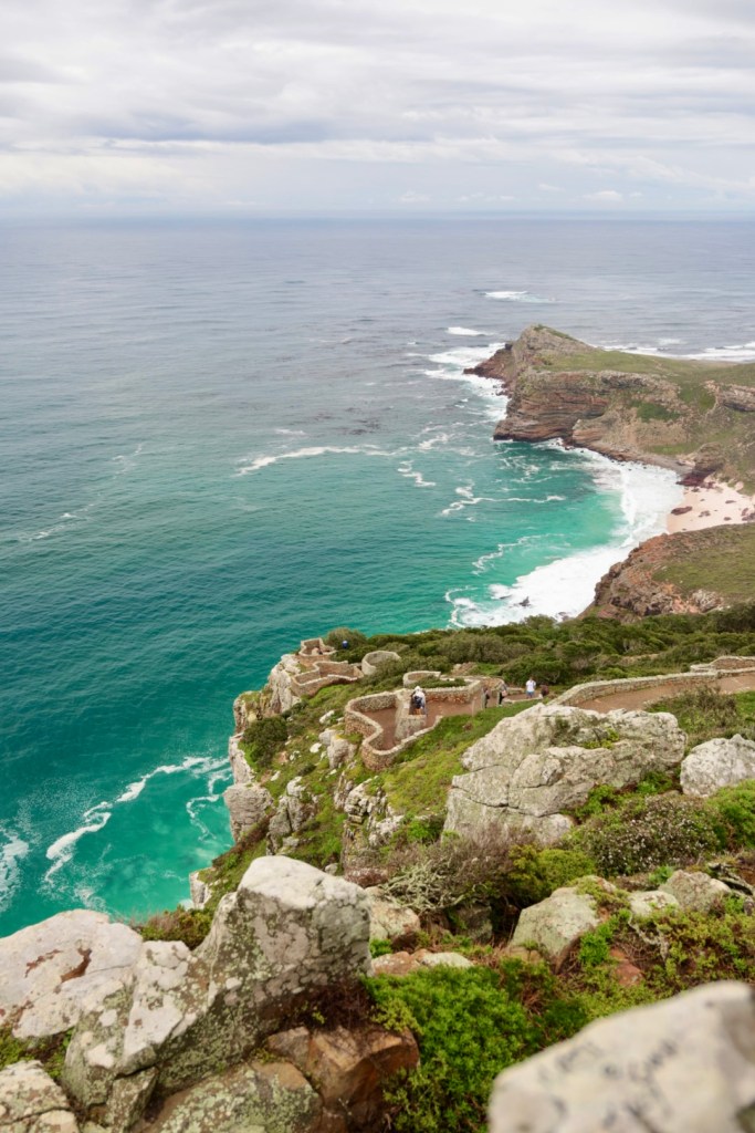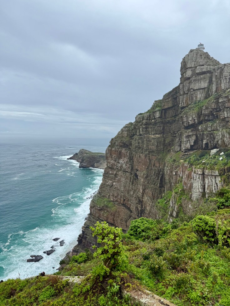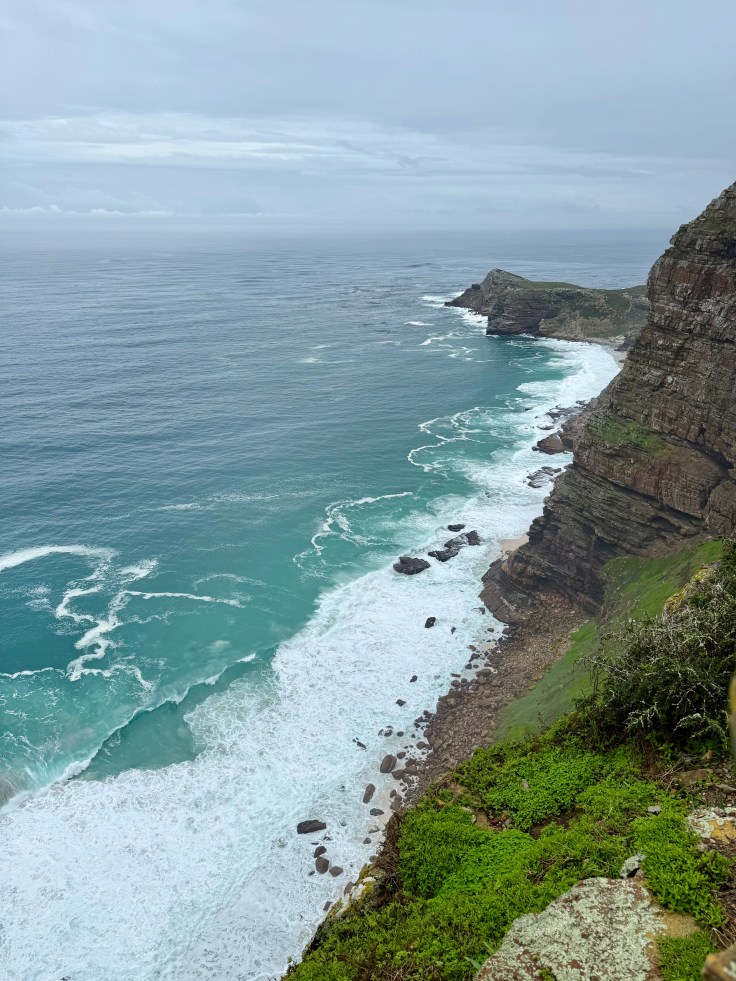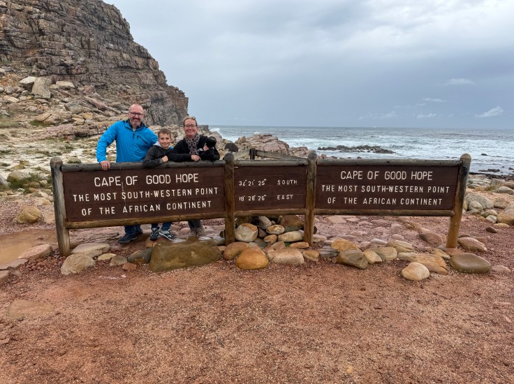 Aber wir beschlossen beim Frühstück mit Traumblick ins Einheitsgrau, dass wir trotzdem Richtung Cap fahren wollten. Gesagt getan und ab zum südwestlichsten Punkt von Afrika. Da war ich schon vor 18 Jahren und textete gleich mal meine Mitreisenden zu, was es da alles gibt: eine Wanderung, viel Wind, Strauße und eine tolle Küste.