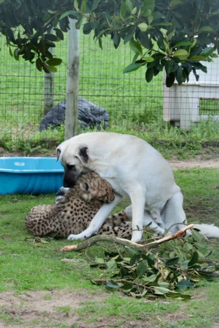 Nachdem ich, okay wir, als VIP zu den Geparden gebracht wurden, entdeckten wir als erstes einen jungen Geparden im Spiel mit einem Schäferhund-Welpen. Hund und Katze und beide hatten richtig Spaß. Sie sind wohl gleich alt, gerade mal 8 Monate, was man diesen Riesen gar nicht ansieht. Und es ist köstlich zu beobachten, wer hier wen stänkert. Es ist wie im wahren Leben immer die Katze, die anfängt.