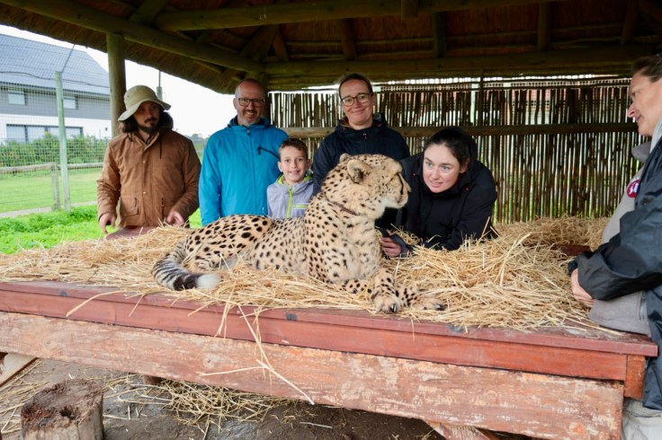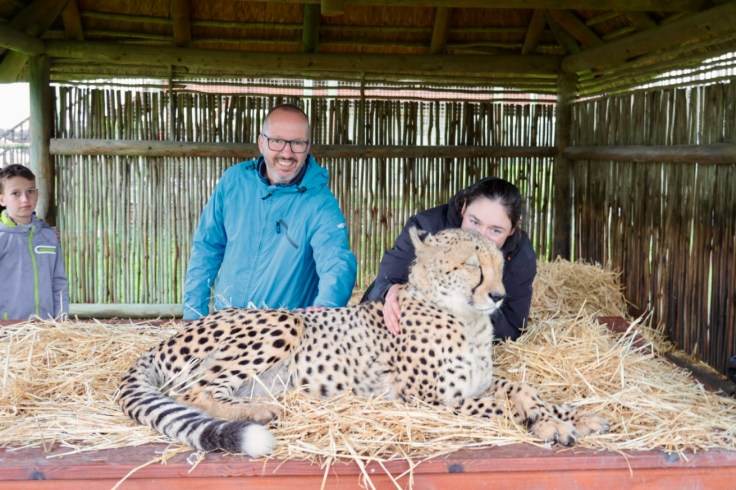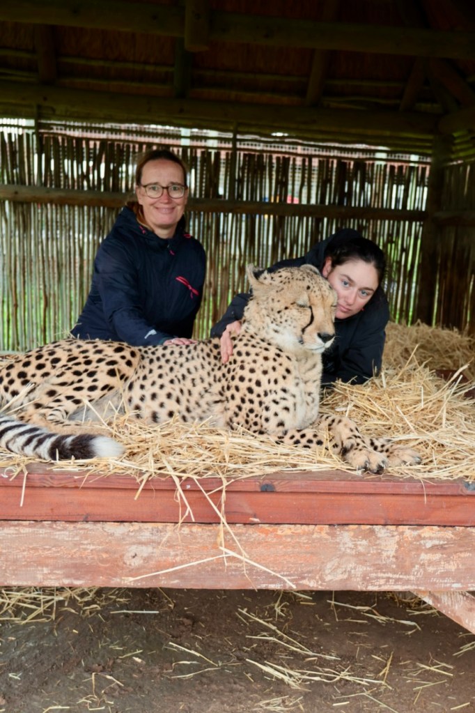 Doch irgendwann ist es endlich soweit und wir dürfen, begleitet von zwei Volunteeren, in Reih und Gleid hinein in das Gepardengehege. Dort treffen wir auf Tobias, einen 8 jährigen Geparden, den man somit schon alten Herrn taufen kann. Er wird ruhig gehalten von 2 weiteren Volunteeren. Damit fühle ich mich schon etwas sicherer und Georg auch.