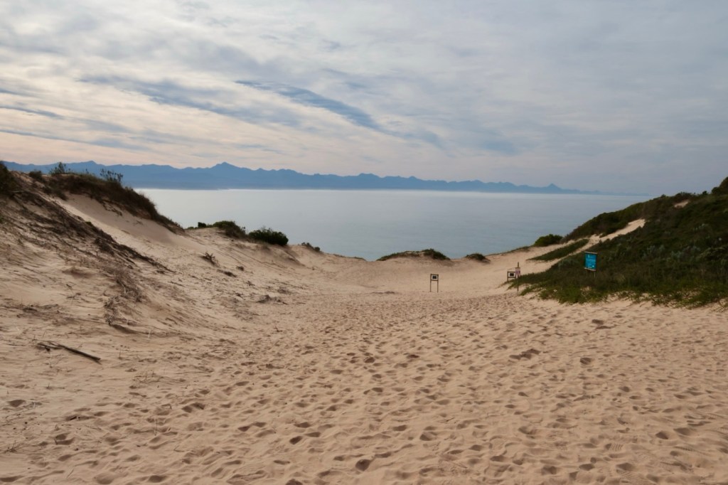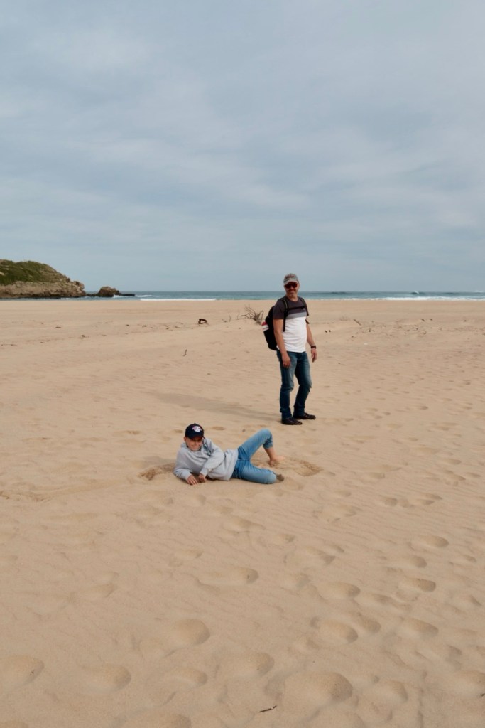 Aber dennoch war es eine fantastische Wanderung. Besonders der Teil, als wir diese riesige Düne hinunter zum Meer durch tiefen Sand rennen mussten. Um die Dimensionen zu erahnen, muss man auf dem einem Foto die kleine Stecknadel in der Mitte des Bildes suchen. Das war Georg, der die Düne förmlich runter geflogen war.