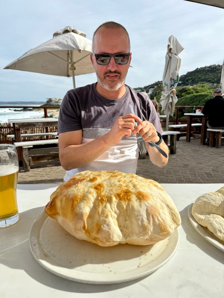 Als Vorspeise bestellten wir uns zwei kleine Knoblauchbrote zu dritt und waren überrascht, was uns auf den Tisch gestellt wurde. Die Tatsache, dass das Knoblauchbrot hier „Bomba“ hieß, haben wir irgendwie überhört oder schlichtweg namentlich nicht mit einem Knoblauchbrot in Verbindung gebracht. Aber der Name war Programm und so waren unsere zwei Knoblauchbrote einfach nur bombastisch groß, aber auch fluffig.