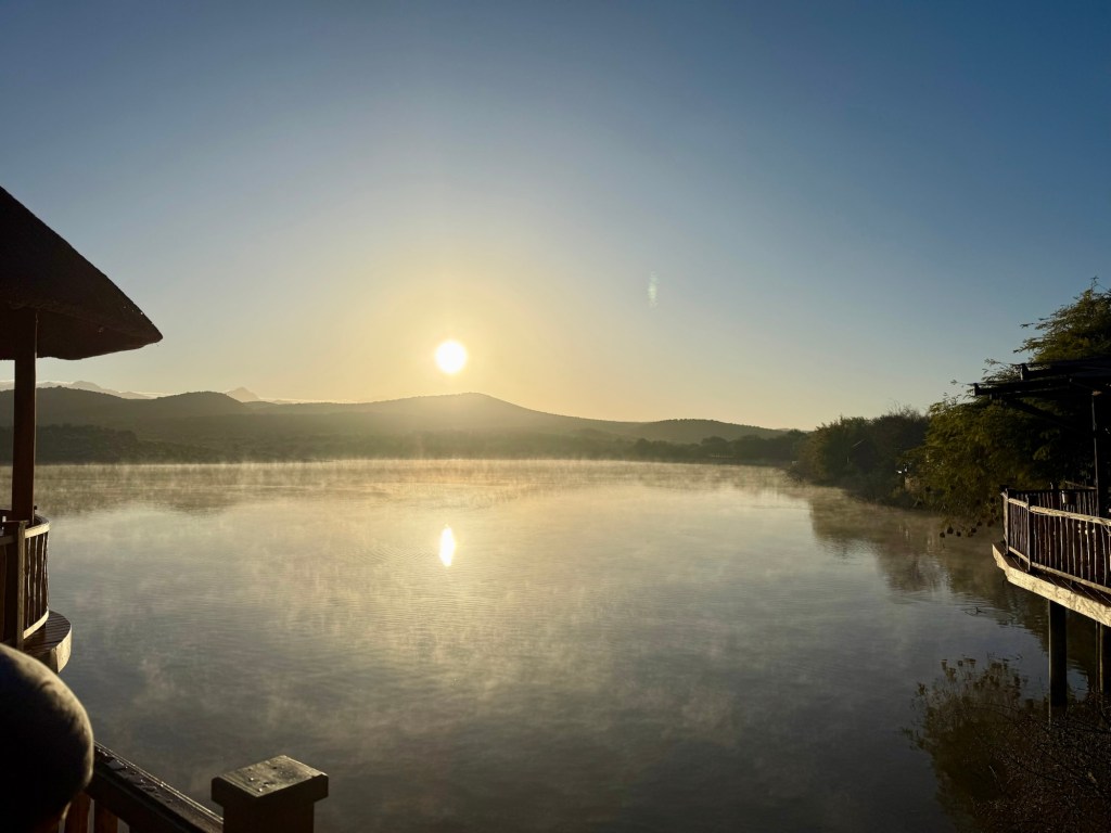 Naja, für uns hieß es ja heute mal wieder Ortswechsel und so packten wir unseren kleinen Koffer, frühstückten und genehmigten uns noch eine Frümorgen-Safari. Wenigstens hatte es aufgehört zu regnen, dafür dampfte nun aber das Wasserloch und jede andere Wasseransammlung im Gebiet. Es sah wunderschön aus, fühlte sich aber nach „Schnell zurück ins Bettchen“ an. Das hielt uns aber nicht davon ab, nochmals festzustellen, dass Georg die besten Augen hat. Sehen kann er alles, auch die Sachen, die er gar nicht sehen darf, wie zum Beispiel versteckte Geschenke, aber hören kann er dafür gar nicht. Die Sinne sind ungleichmäßig verteilt. Wir in unserem Alter können weder gut sehen, noch hören, geschweige denn rennen, wenn wir auf einen Löwen treffen. Das nenne ich gleichmäßige Sinnesverteilung.