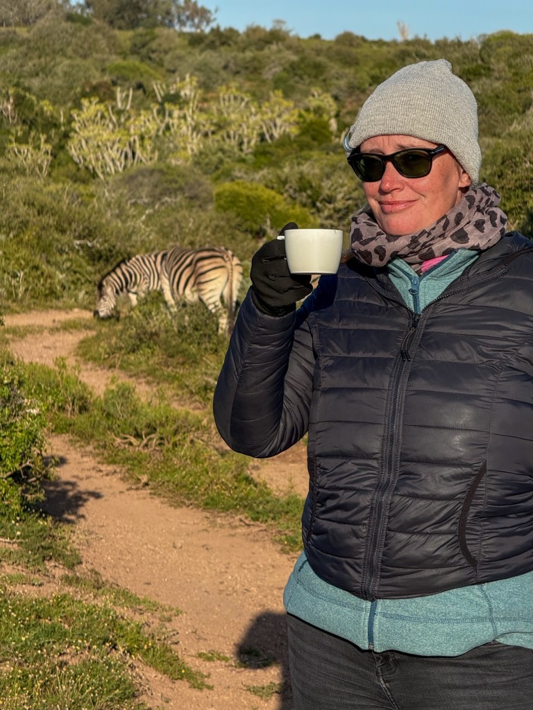 Nach so viel Tiersichtung am Morgen ging endlich die Sonne auf und wärmte unsere unterkühlten Körper. Natürlich gab es noch einen schnellen Kaffee am Auto und das umringt von Zebras. Solch ein Frühstück würde ich mir für zu Zuhause wünschen und dafür glatt Frostbeulen akzeptieren. Die Stimmung an solch einem Morgen kann man kaum in Worte fassen.