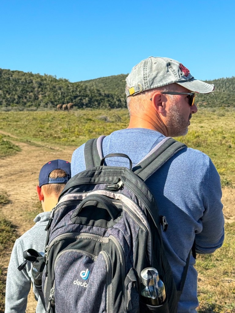 Heute ging es nach dem Frühstück auf zu einer gemeinsamen Wanderung. Ich musste Swen vorher mindestens zehnmal schwören, dass wir hier um unser Camp, also noch vor den Jurassic Parc Toren auf Wanderschaft gehen werden. Nur so war er bereit mitzumachen. Da half es wenig, dass uns Forrest für den Beginn der Wanderung erst einmal durch alle drei Tore fuhr und dann genau da parkte, wo wir an den Vortagen noch nach Löwen gesucht hatten. Tja, nun konnte ja Swen schlecht sagen: Ich bleibe dann mal im Auto. Also ging es für uns alle los, im Gänsemarsch hintereinander weg. Die Tatsache, dass Forrest noch schnell ein Gewehr mit Patronen lud und reichlich Extra-Patronen einpackte trug seitens Swen deutlich zum Sicherheitsgefühlt bei. Ich finde das immer eher verunsichernd, denn warum braucht man erst ein Gewehr? Hier wäre es besser gewesen, wenn Forrest behauptet hätte: Heute ist es so ungefährlich, dass ich glatt das Gewehr im Auto lassen kann. Aber nein, männliches Machtgehabe wirkt auch hier. Nur nicht auf die Elefanten, die wir verfolgen würden, denn denen war es völlig schnuppe, ob einer von uns eine Flinte dabei hatte. Die haben uns nämlich in unserem Annäherungsversuch komplett ignoriert.