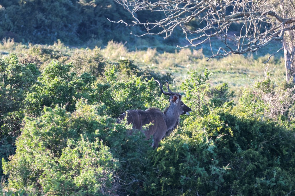 Aber eine Safari ist auch ohne Löwen und andere Highlights, mit denen uns unser Guide immer zu versorgen versuchte, ein wahrer Genuss. Denn es gibt einfach so viel Leben hier. Wenn ich mich in Deutschland auf eine Waldwiese stelle, freue ich mich schon wie ein Eichhörnchen, wenn ich mal ein Reh oder einen Falken sehe. Aber hier ist es einfach Wahnsinn. Vor uns liegt eine weite Ebene und es werden minütlich mehr Tiere. Mit jedem Sonnenstrahl, der es über die Berge schafft, steigt die Temperatur und damit die Anzahl der Tiere, die sich hier aufwärmen wollen. Da sind Herden von Impala‘s, männliche und weibliche Gruppen von Kudu‘s und Nyala‘s, die über die Wiesen grasen. Dazu kommen noch, ich weiß nicht wieviele Familien von Warzenschweinen, die ich persönlich ja für ihr Panikverhalten liebe. Solange unser Auto in Bewegung ist lassen sie sich nicht stören und trotten über die Ebenen. Doch sobald der Wagen hält und man den Fotoapparat in Anschlag bringt, wetzen sie davon und stellen ihren Schwanz senkrecht gen Himmel. Das sieht immer wie eine Antenne auf der Suche nach Empfang aus. Total süß.