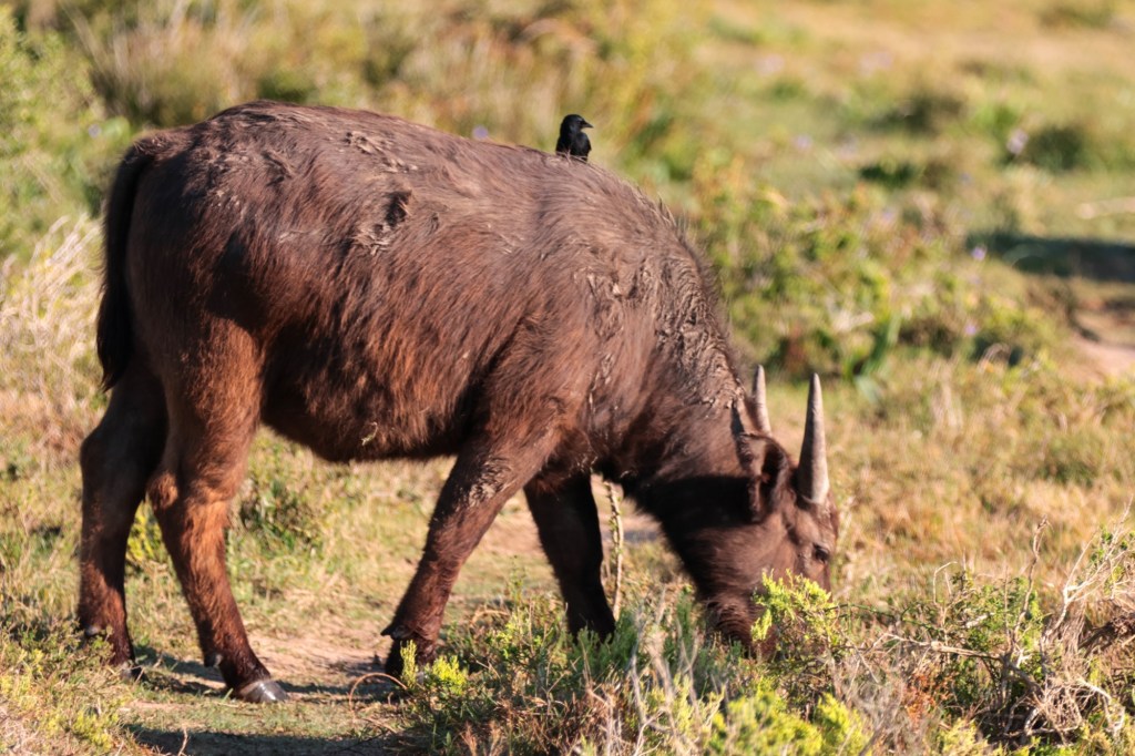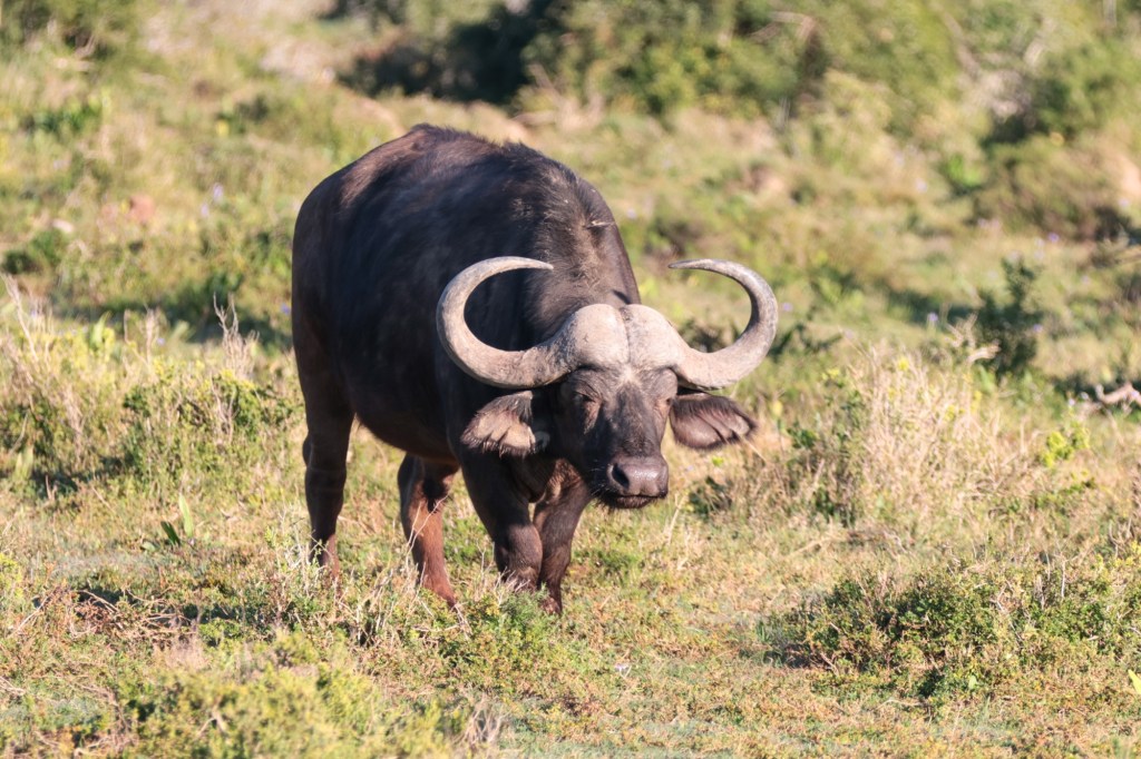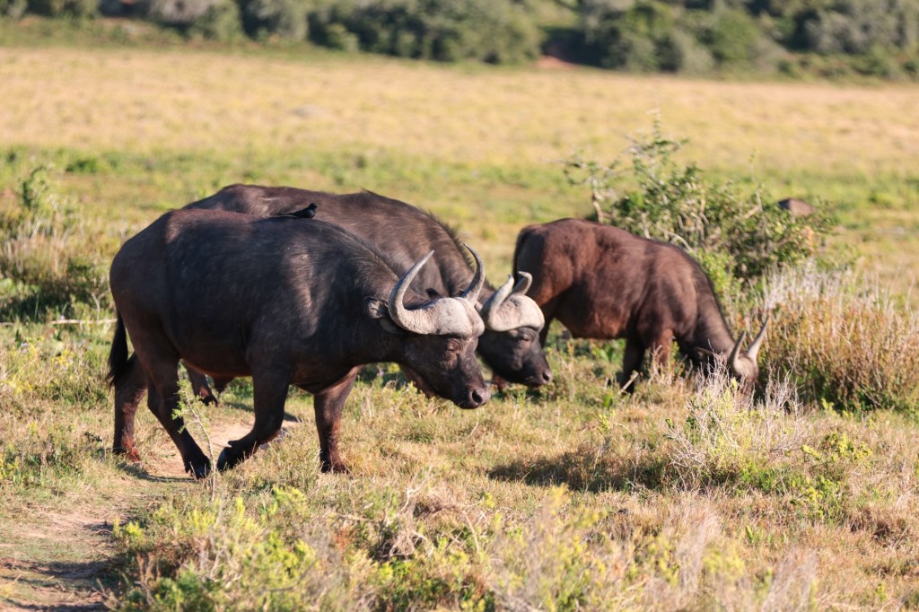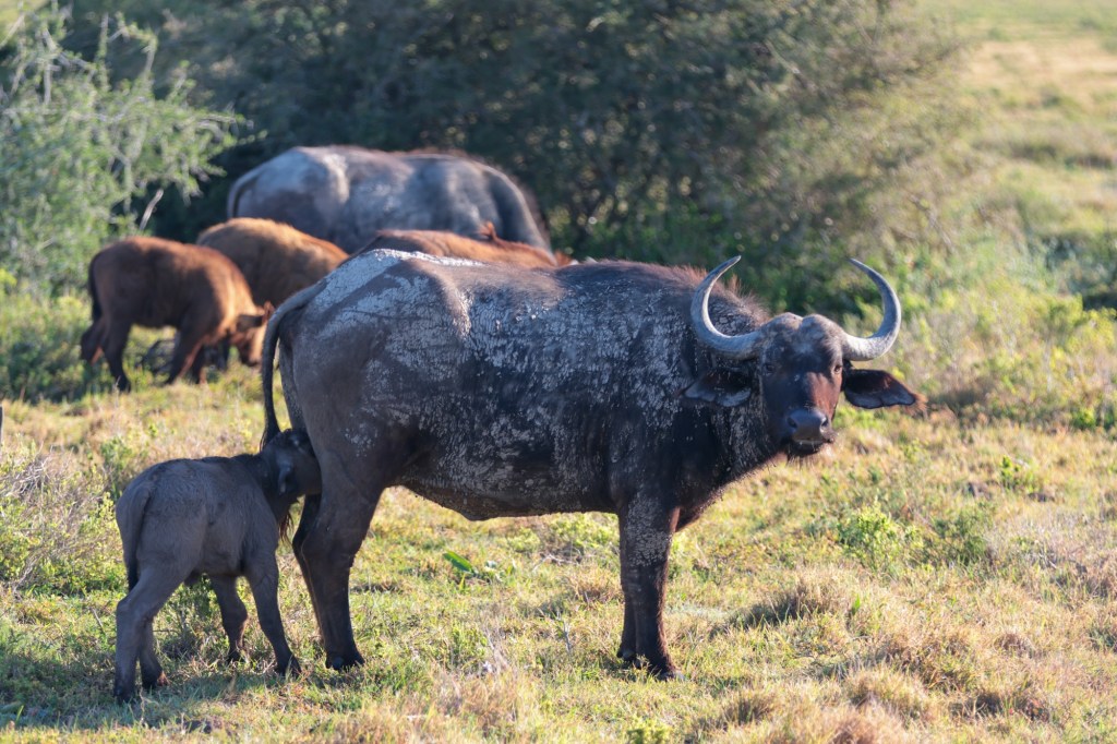 Irgendwann bestiegen wir dann trotz der Idylle wieder unseren Jeep und fuhren noch ein Stück. Dabei entdeckten wir eine riesige Büffelherde beim Morgenmahl. Wieder ganz viele Jungtiere und ihre Eltern mit diesen wirklich respekteinflössenden Hörnern. Während erst alle gedankenverloren und durcheinander grasen, pupsen und wiederkäuen, stehen plötzlich sämtliche Bullen aufmerksam da und recken ihre Köpfe gleichzeitig in eine Richtung. Während uns das erst mit Verzögerung auffällt, ist Forrest sofort alarmiert und steuert das Auto in die Blickrichtung. Grundlos schauen über 50 Büffel nie irgendwohin. Also muss es einen Grund geben. Und der war auch gleich zu hören, denn oben auf dem Berg hatte irgendwas eine kleinere Elefantenherde aufgescheucht, die nun laut schimpfend in einem Elefantenzahn den Berg runter gerannt kam. Was der Grund war wussten wir nicht, aber es war noch einmal sehr beeindruckend.